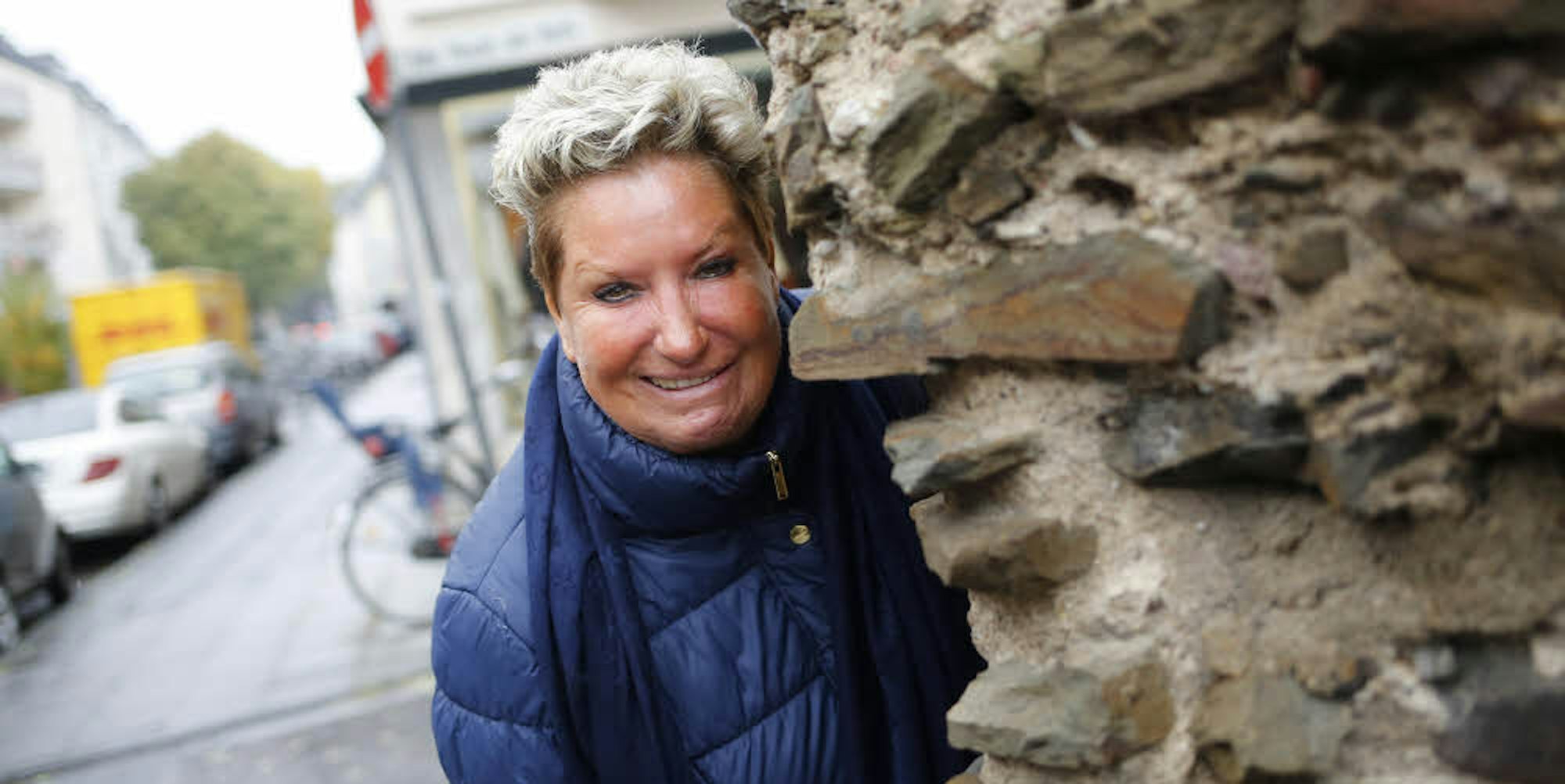 Marita Köllner vor einem Stück Römermauer, das mitten im Veedel steht.