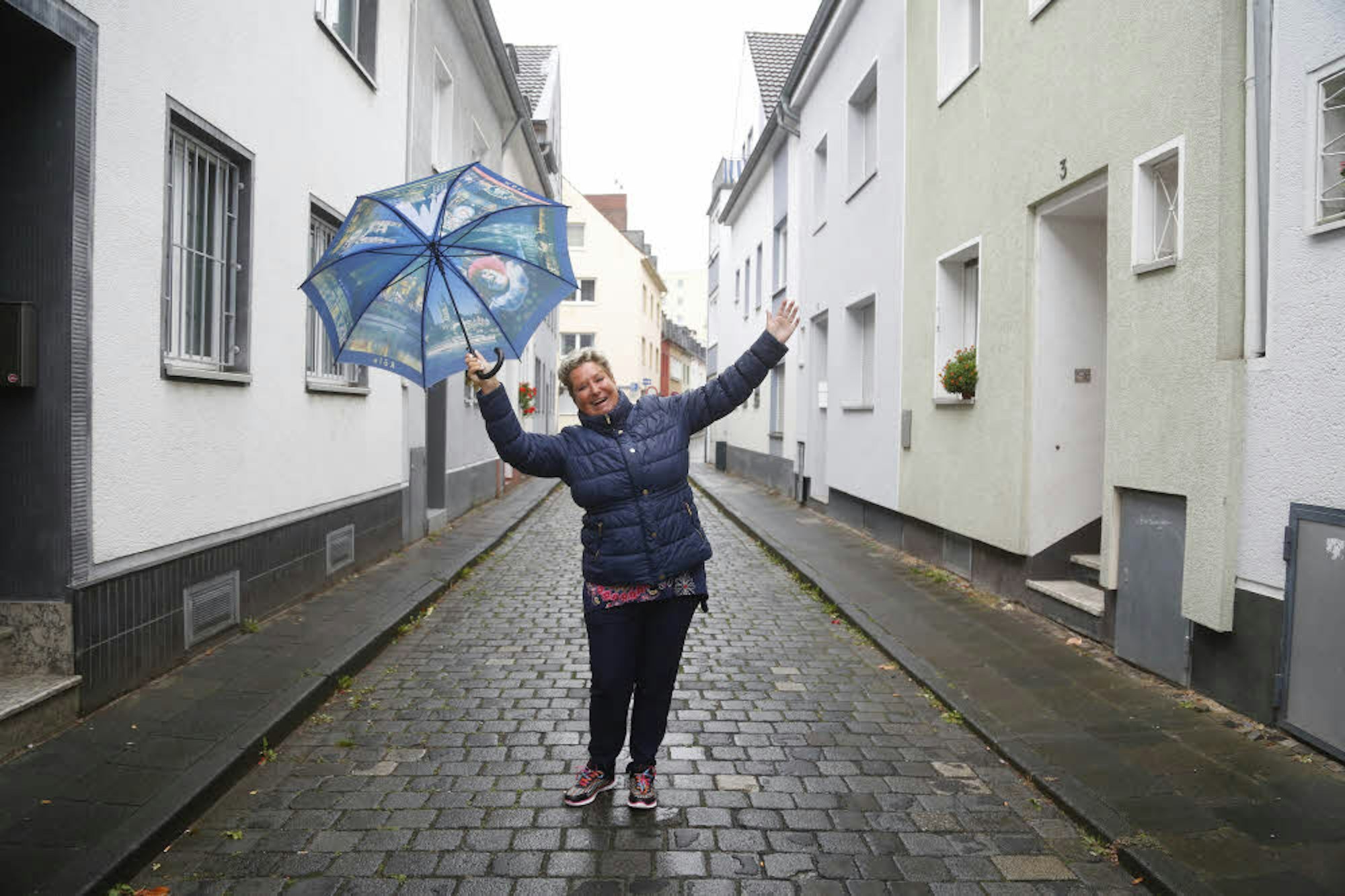 Sie tanzt mit dem Köln-Schirm übers Kopfsteinpflaster der Schemmergasse: Sängerin Marita Köllner.