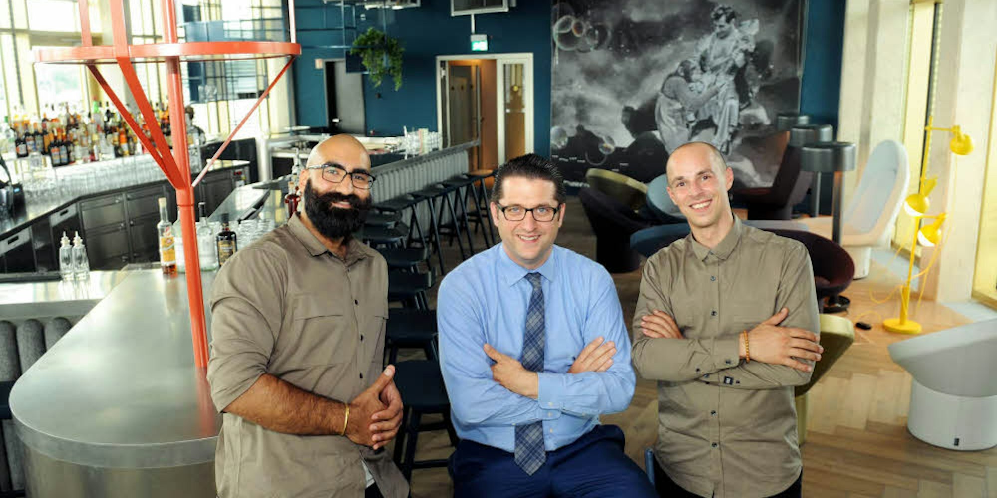 Rastin Mahrou (v.l.), Jörg Meyer und Dario Gajewski bieten in der „Monkey Bar“ Cocktails mit Kölner Spirituosen an.