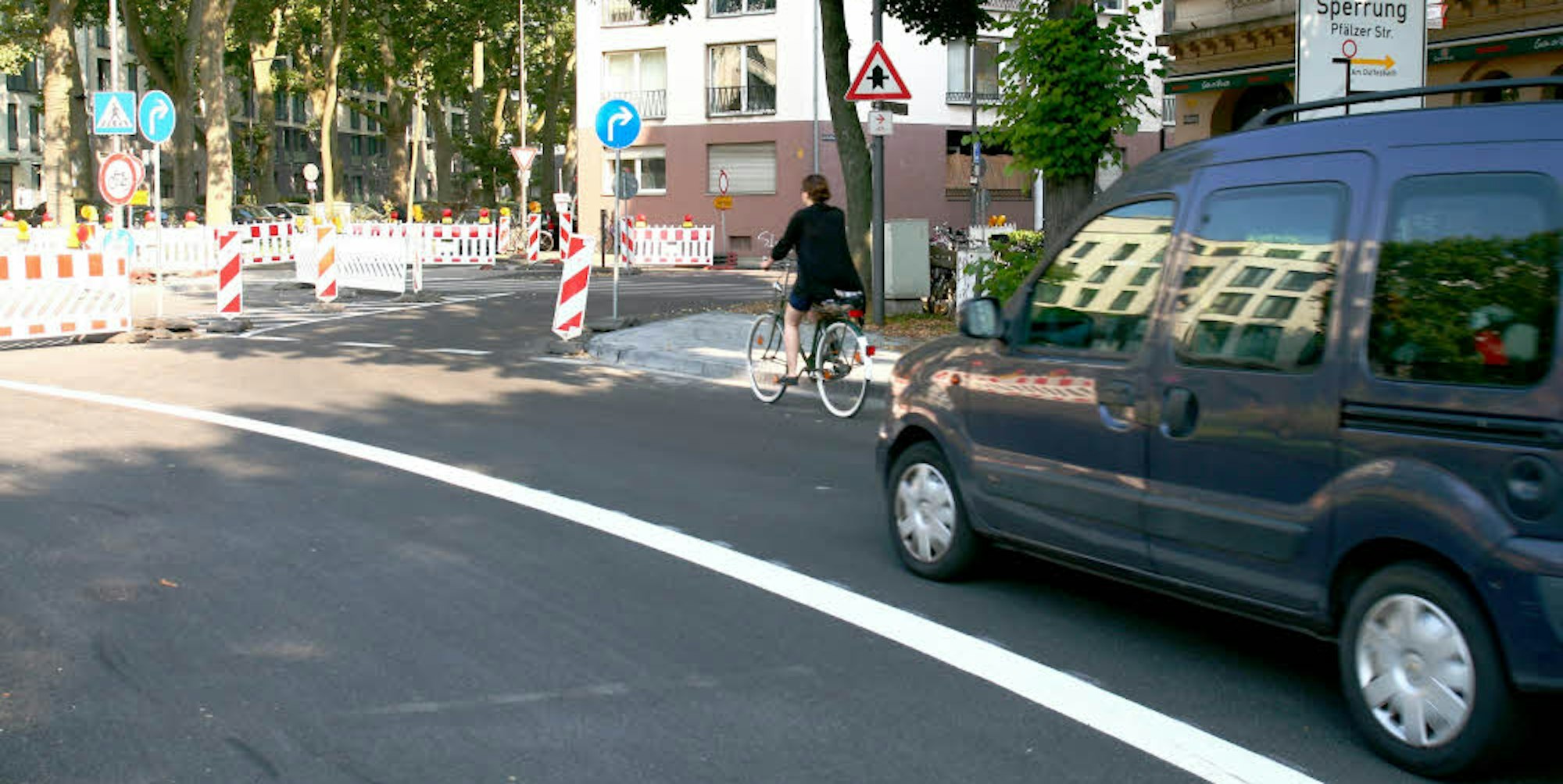 Die Fahrbahn ist enger als vorher, die Bordsteinkante näher an die Mittelinsel heran gerückt. Vor allem an der Einmündung der Straßen Am Duffesbach und Pfälzer Straße begrenzen Bordsteine den Platz, den sich Radfahrer und Autofahrer im Kreisverkehr teilen müssen. Zwischen den Fahrbahnen der Volksgartenstraße verbieten weiß gestreifte Sperrflächen die volle Nutzung der Straße. Weniger Platz für mehr Sicherheit? Paradox wirkt auch die Entscheidung, auf den Schutzstreifen für Radfahrer im Kreisverkehr zu verzichten.