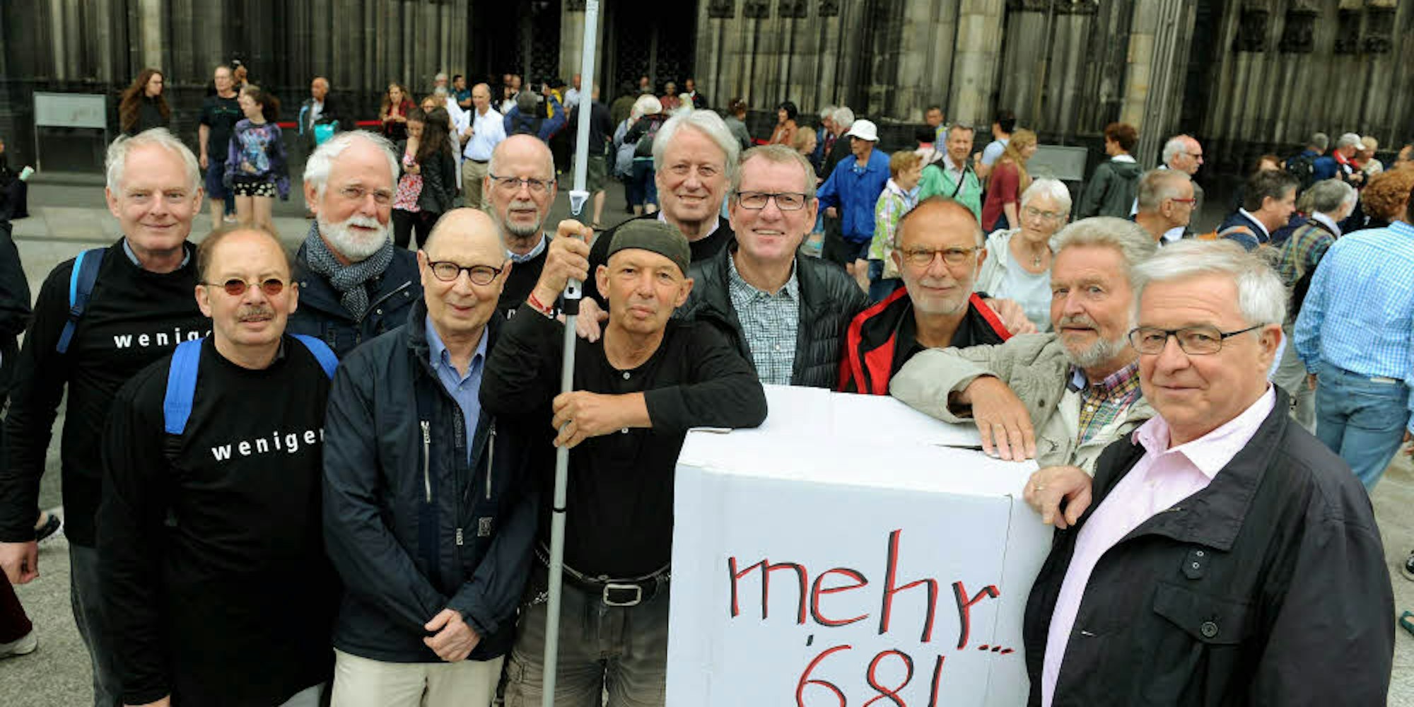 Köln-Innenstadt – Mehr 68! Mit schwarzem und rotem Edding-Stift hat Josef Wolf diese Parole auf einen Karton geschrieben. Wörter wie Mut, Leidenschaft, Klarheit, Engagement stehen auch darauf. Und Ungehorsam. Auf den ersten Blick will sich das nicht so recht ins Bild der elf ergrauten Herren fügen, die sich zum 50. Jahrestag ihres Abiturs am Kölner Dreikönigsgymnasium auf der Domplatte getroffen haben. Gutbürgerlich sehen die meisten von ihnen aus: der Genetik-Professor Peter Schreier; Wolf selbst, der als Business-Coach und Mediator für die Industrie arbeitet, und Wolfgang Schmitz, der es vom Schulsprecher bis zum WDR-Hörfunkdirektor gebracht hat.