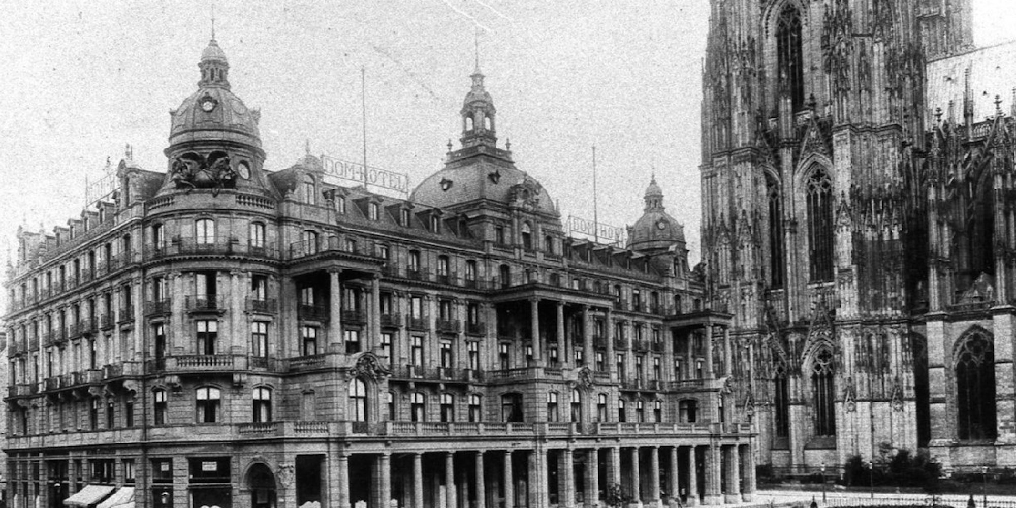 Ein Dach mit Kuppeln und Türmen zierte das Dom-Hotel bis zu einem Bombenangriff im Zweiten Weltkrieg. Foto eines unbekannten Fotografen.
