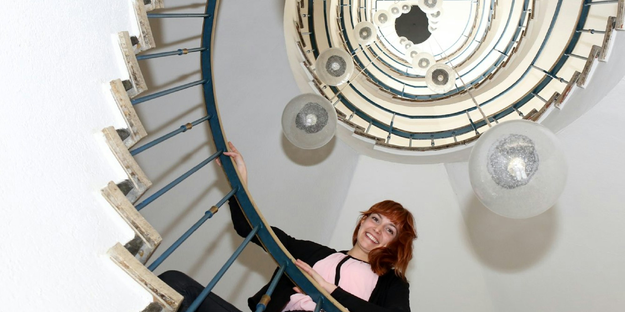 Stefanie Weidner vom „Solution Place“ im original erhaltenen Treppenhaus aus den 50er Jahren