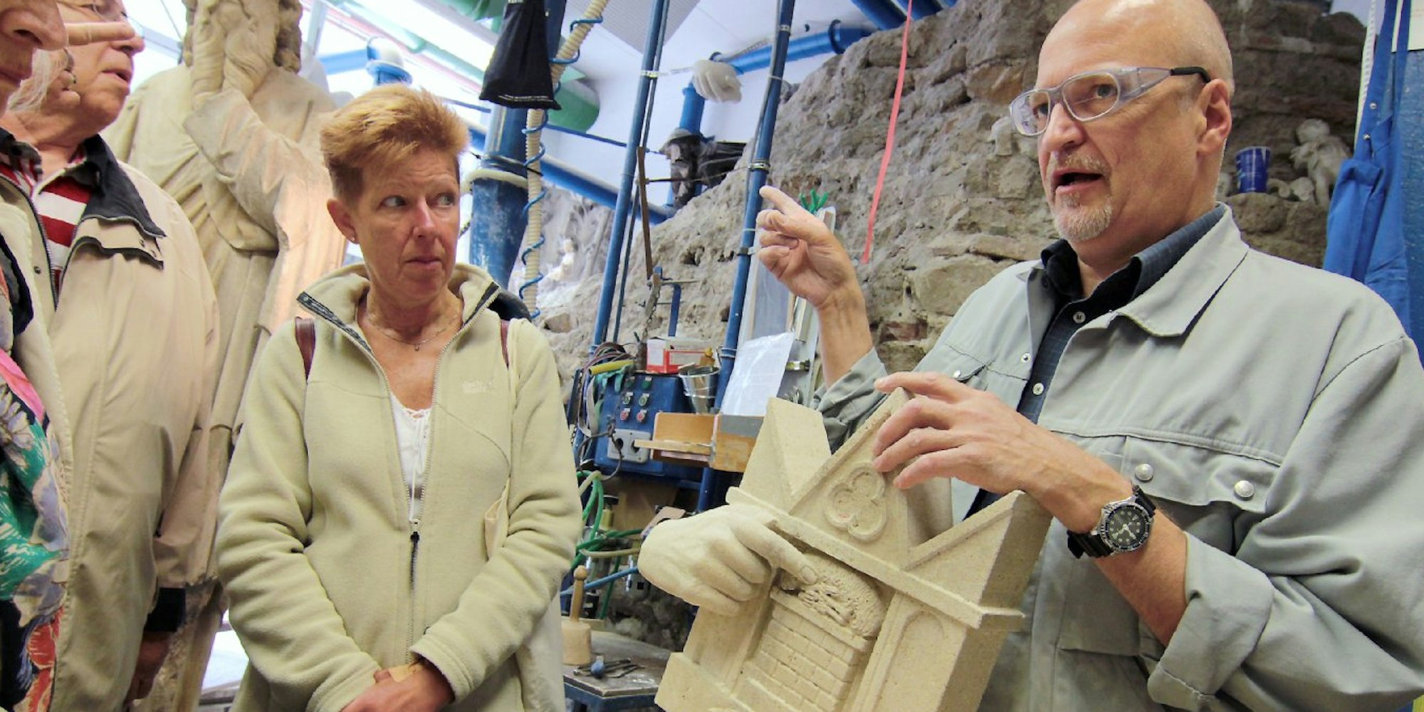 Bildhauer Michael Oster erläuterte den Besuchern in der Dombauhütte seine Arbeit.