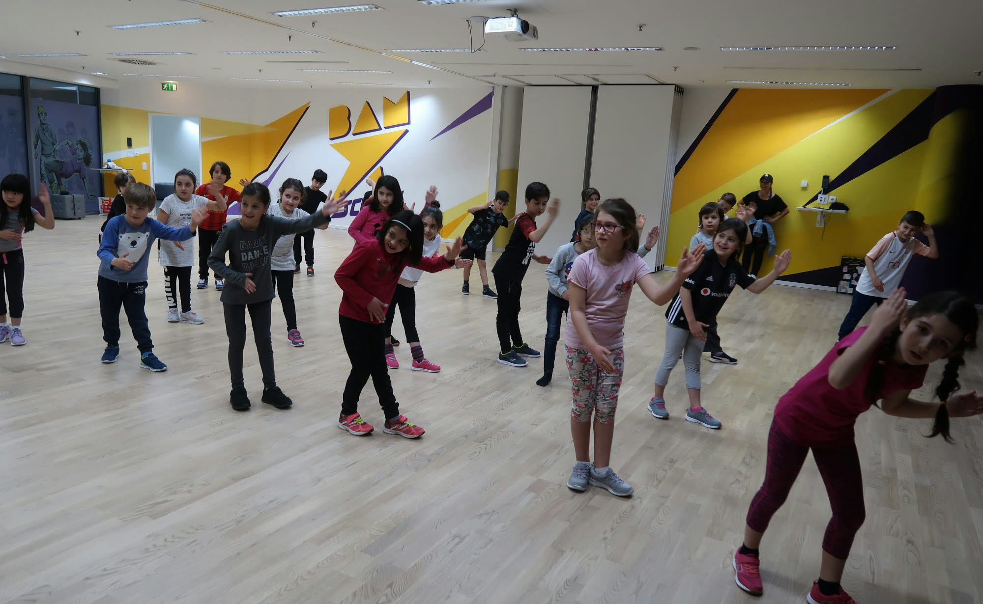 Niehl/Innenstadt – Die Anfangs-Nervosität und Aufregung der Grundschüler aus der Nesselrodestraße beim Besuch bei ihrem Idol legt sich schnell. Herzlich nimmt das Trainerteam der „Bamschool“-Tanzschule im Mediapark, Nadine und Rae, die 25 Kinder in Empfang – und sogleich geht es mit Aufwärm-Übungen vor der deckenhohen, den ganzen Raum füllenden Spiegelwand los. „Ich sehe schon, ihr seid alle topfit. Aber wer von Euch hat denn schon mal getanzt?“ fragt Nadine die Zweitklässler. Rund zehn von ihnen haben da schon Erfahrung.