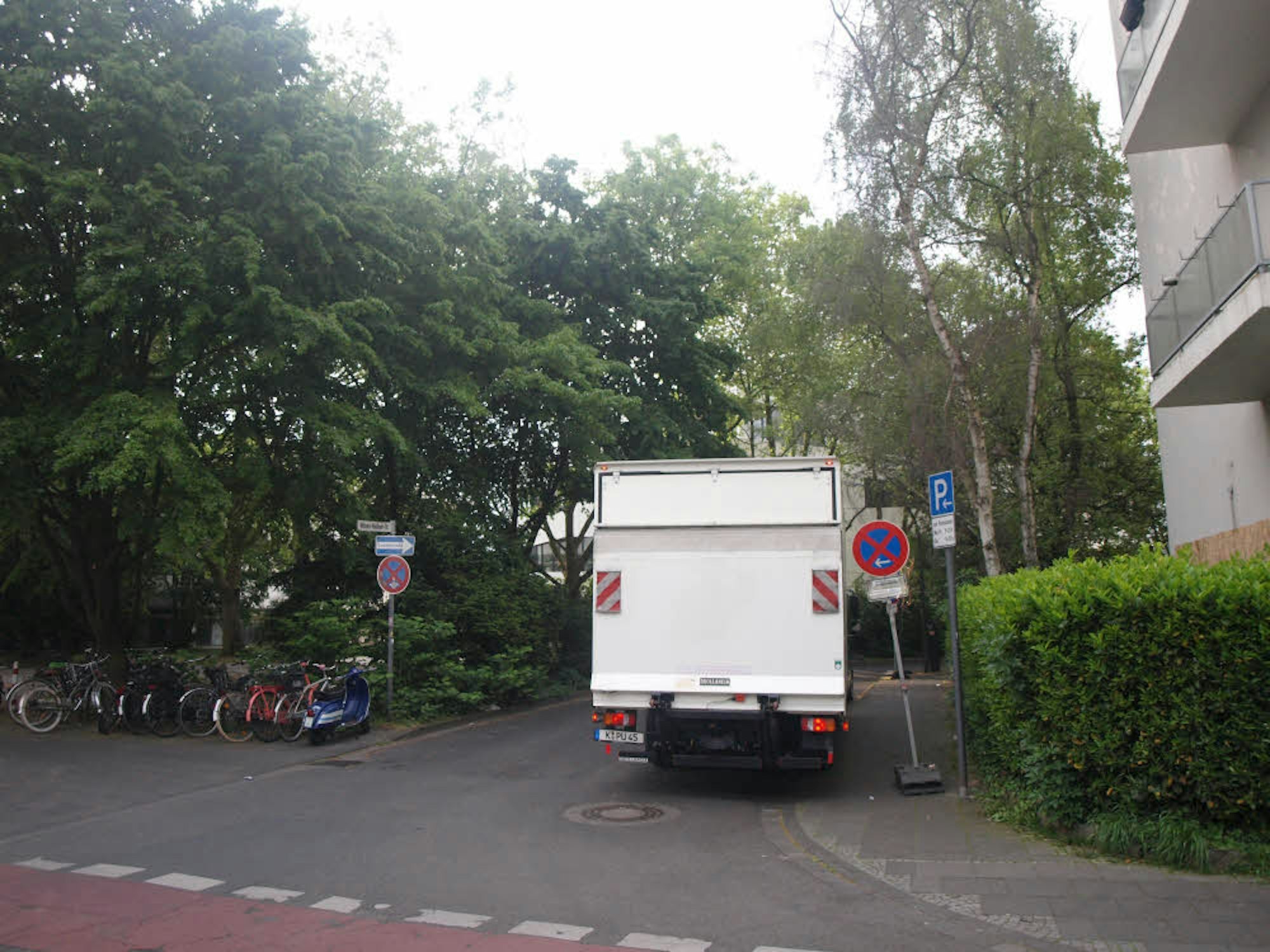 Dort blieb nur noch ein Ausweg: die schmale Wilhelm-Waldeyer-Straße, in die Autos kurz vor der Absperrung abbiegen können. So quälte sich der Autoverkehr und mancher Lkw mehr oder auch minder erfolgreich durch das Sträßchen – zum Entsetzen der Anwohner: „An einem Tag musste ein Verkehrspolizist fünfmal in unsere Straße kommen. Durchfahrende Lkw hatten geparkte Autos beschädigt, und mehrmals sind Lkw in der Straße hängen geblieben“, berichtet Pia Fried, die an der Straße wohnt.