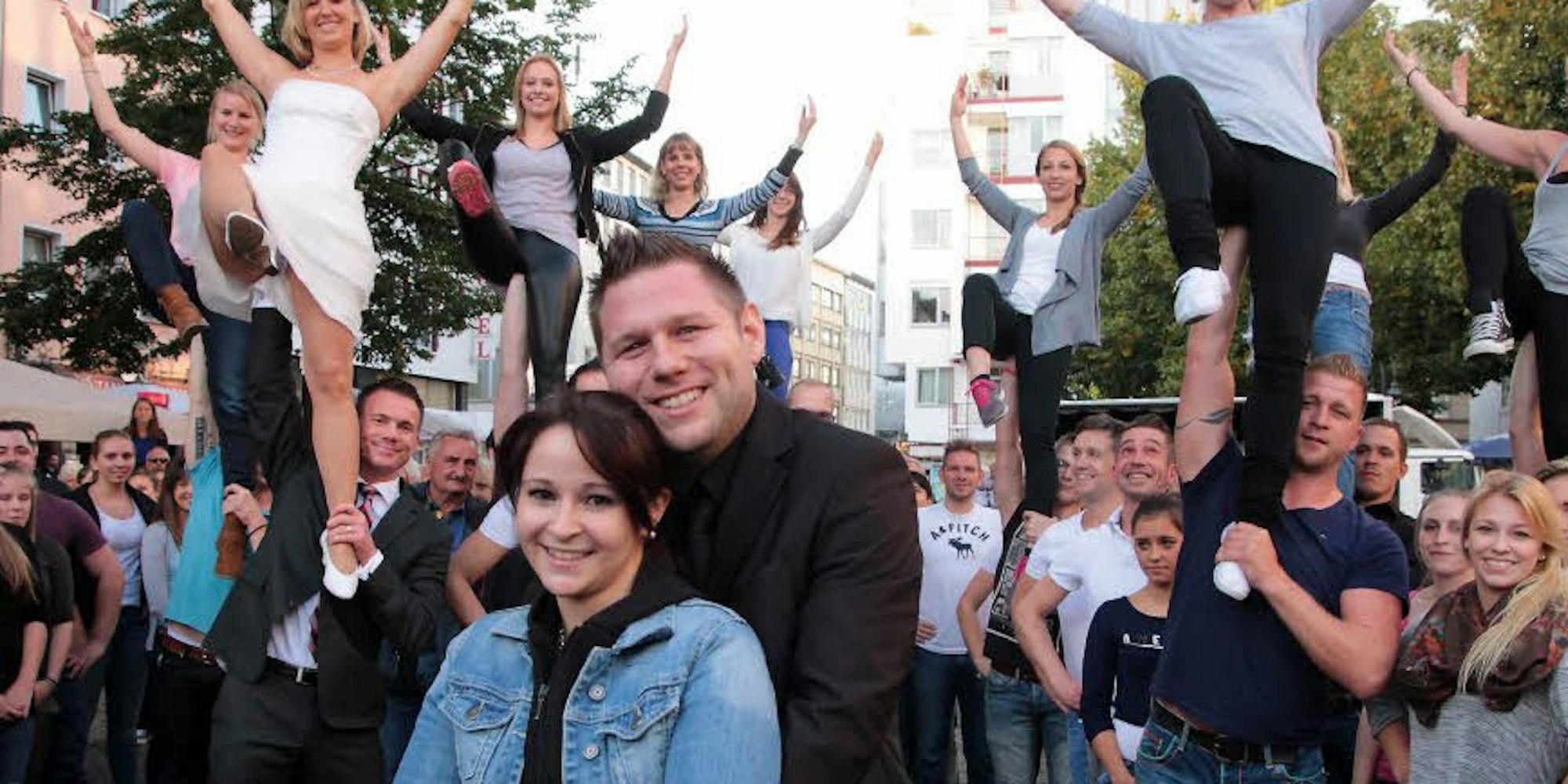 Faßbenders ahnungslose Freundin war von einer Kollegin mit der Aussicht auf einen fröhlichen Mädelsabend in die Stadt gelockt worden. Doch als die Musik loslegte und aus allen Ecken rund 100 Tänzer und Tänzerinnen – von den Kölschen Greesbergern, den Reinveilchen, der Stattgarde Colonia Ahoij und anderen – sich zur gemeinsamen Aktion aufbauten, begannen bei Nicole Hamacher vor Aufregung die Knie zu zittern, ehe ihr Freund sich langsam in die erste Reihe vortanzte und um ihre Hand anhielt.