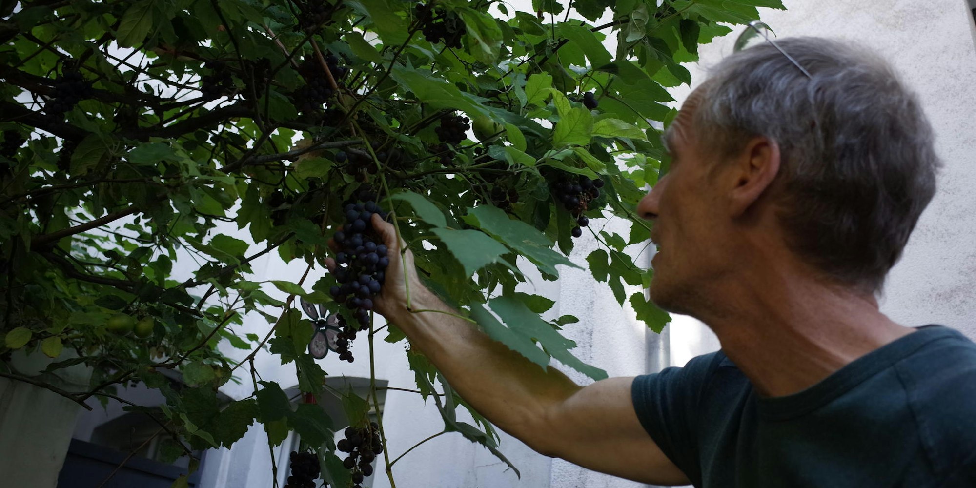 Trauben wachsen zuhauf an seiner Hausfassade.