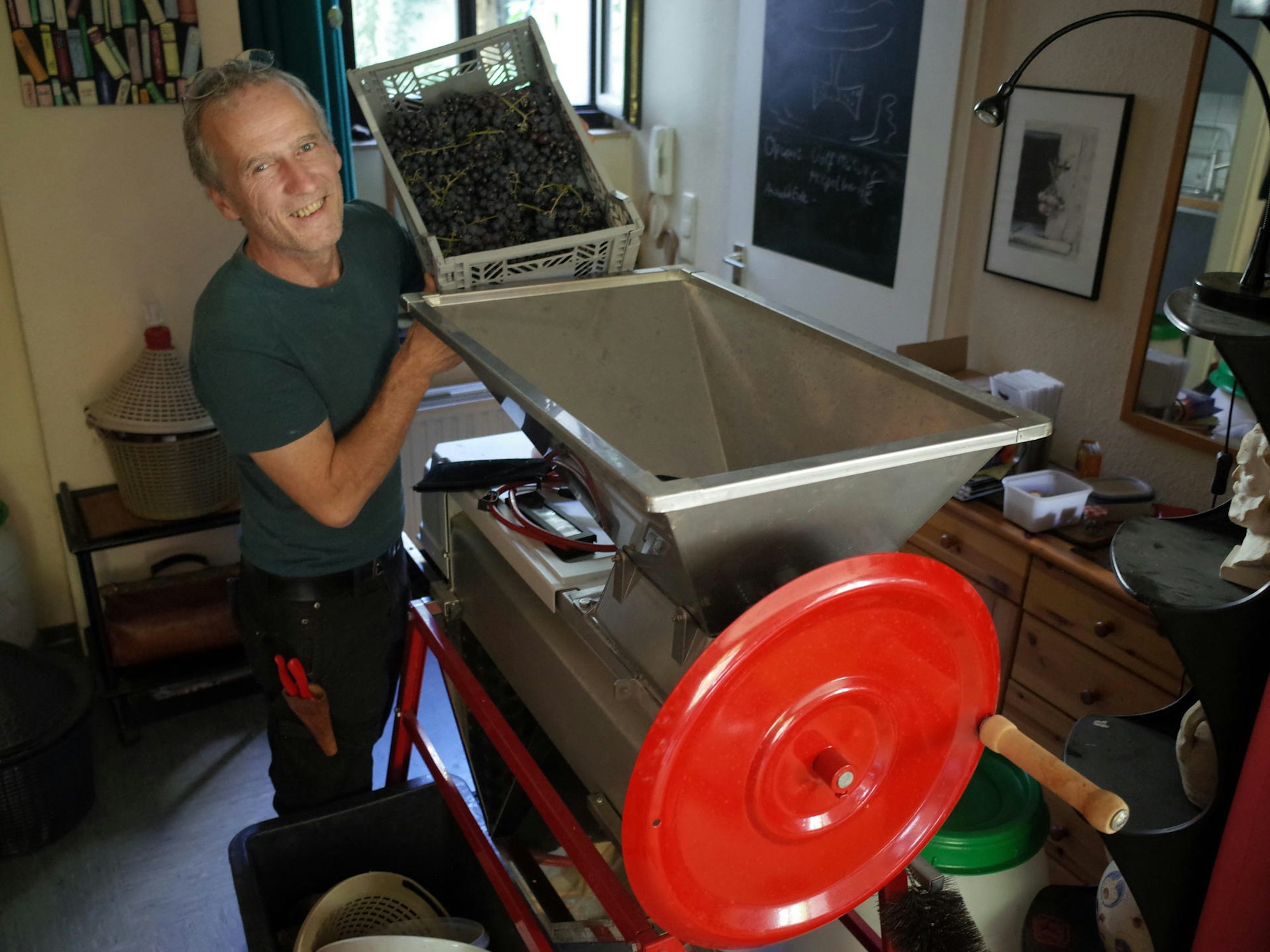 1000 Flaschen Rot- und Weißwein sind mittlerweile zusammengekommen, sein Keller steht voll mit edlen Tropfen der letzten Jahrgänge. Zum Ende des Sommers steckt der sogenannte „Stadtwinzer“ wie in jedem Jahr mitten in der Herstellung des neuen Jahrgangs – seine Wohnung ist mit Auffangtöpfen, der Weinpresse und der riesigen Wanne zum Entrappen der frisch gepflückten Trauben vollgestellt. Überall blubbert und gärt es in den großen Ballons und trotz täglichen Putzens kleben die Holzdielen vom zuckrigen Saft der Trauben.
