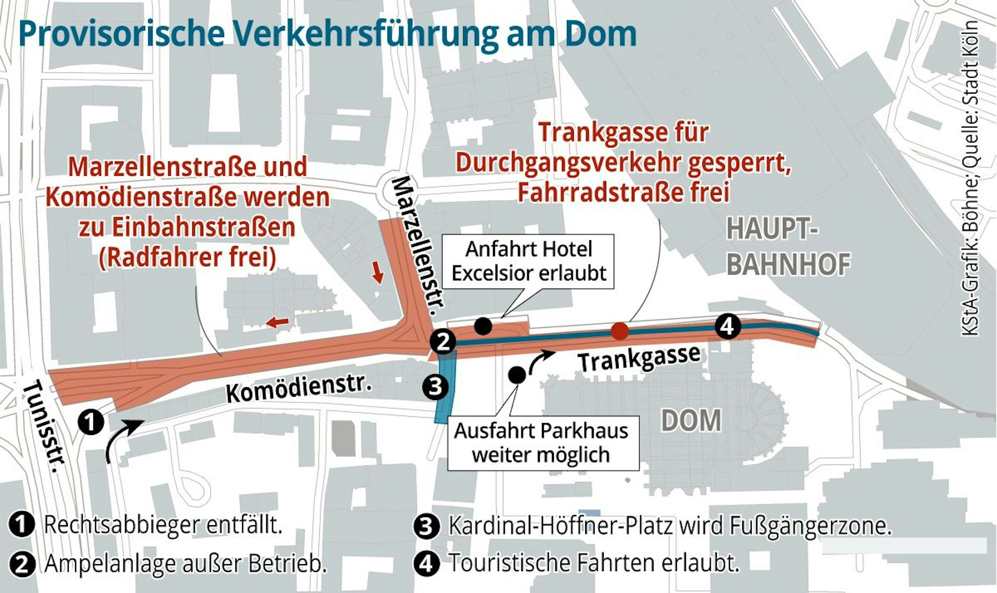 Es gebe weiterhin Beschwerden über größere Staus bei der Anreise zu Veranstaltungen im Musical Dome und der Philharmonie. Bei Zählungen an Samstagen sei insgesamt zwar nur eine geringfügige Zunahme des Autoverkehrs festgestellt worden, die Probleme bei der Anfahrt aus Richtung Rheinuferstraße und aus dem östlichen Tunnel der Trankgasse links in die Straße Am Domhof oder den sogenannten Gulliver-Tunnel ließen sich nicht bestreiten.