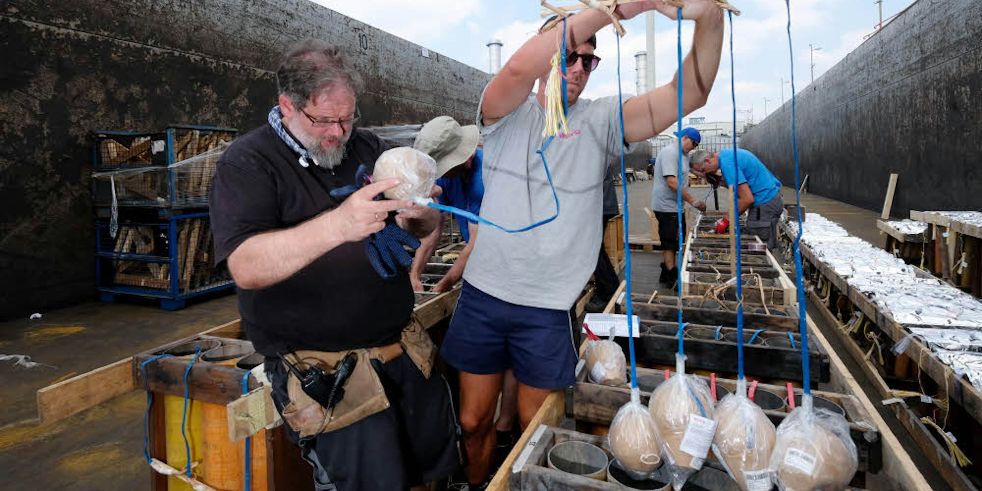 Am Donnerstag haben in Becken 4 des Niehler Hafens die Arbeiten begonnen. Gefahrgutlaster liefern das Feuerwerk an, das Dutzende Mitarbeiter nach genauem Plan positionieren. „Jeder elektrische Anzünder hat eine Adresse“, sagt Georg Alef, Chefpyrotechniker der Eitorfer Feuerwerksfirma Weco. Anhand der Adress-Zettelchen sehen die Mitarbeiter, wie sie die „Position“ zündetechnisch anschließen müssen.