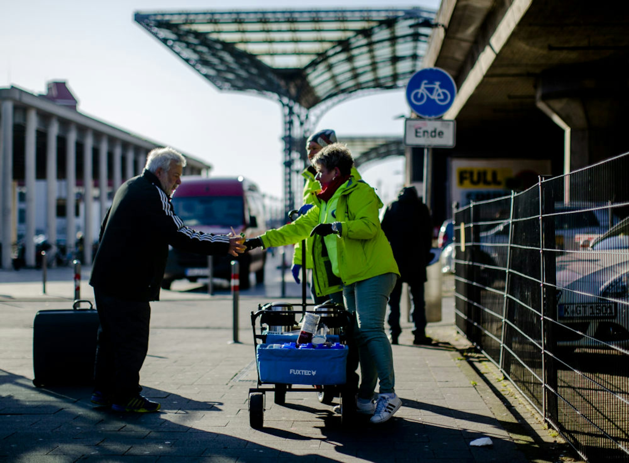 In diesen Tagen passiert etwas am Kölner Hauptbahnhof, gegenüber vom Dom, gleich neben den Containern der Polizei, das sonst überall in der Stadt verboten ist. Menschen kommen im öffentlichen Raum zusammen, viele Menschen. Innerhalb von zwei Stunden werden es an diesem Donnerstagmittag mehr als 130 sein. Manche stehen beisammen, in Grüppchen, unterhalten sich, rauchen, lachen. Andere halten Abstand. Alle holen sich das, was sie brauchen zum Überleben.