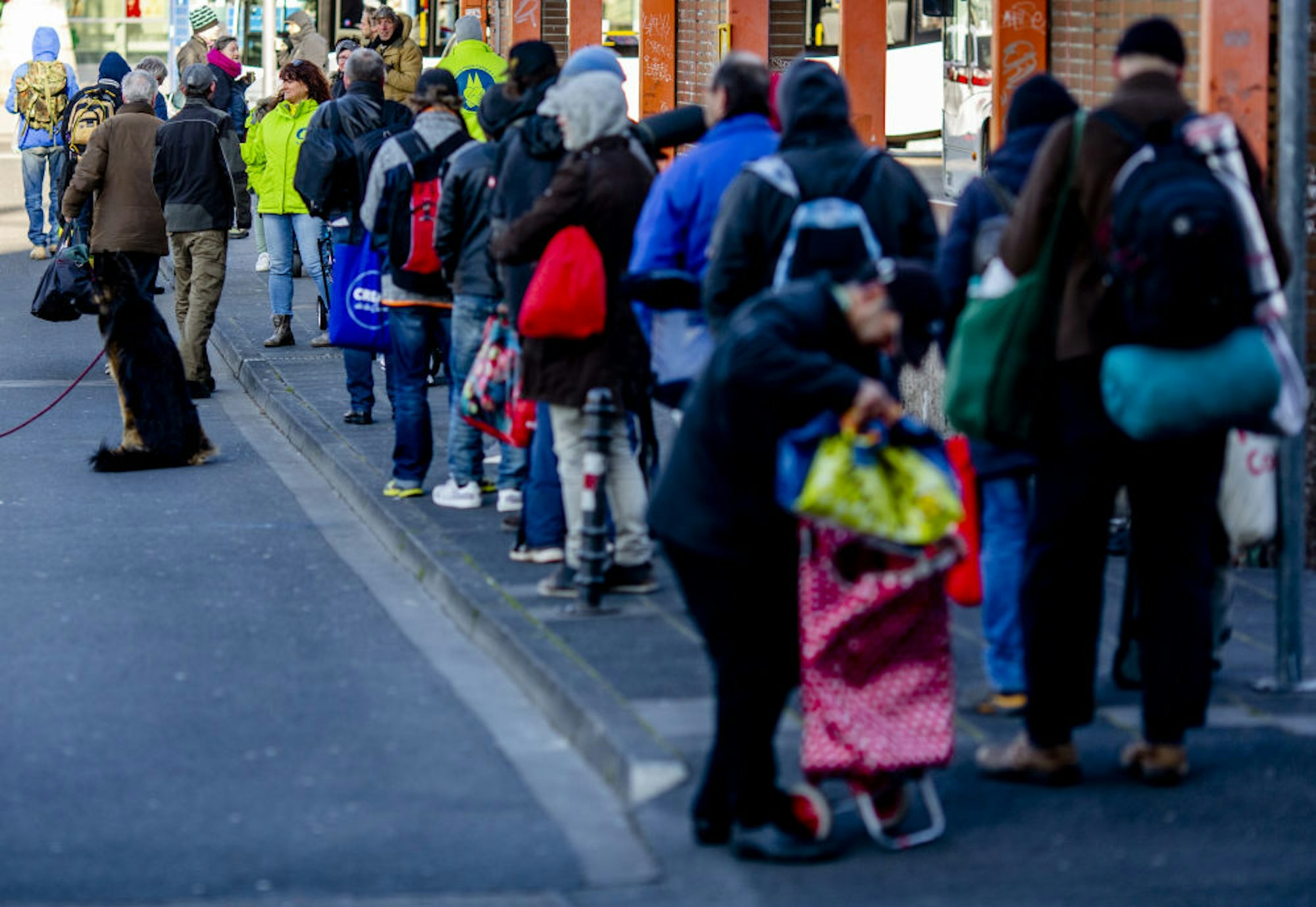 „Die Situation ist dramatisch, seit der vergangenen Woche erleben wir immer mehr Menschen, die einfach nur Hunger haben und sich seit Tagen nicht gewaschen haben – denen also das Grundlegendste fehlt“, sagt Nicole Freyaldenhoven von den Helping Hands, neben ihr ein Bollerwagen. 200 Brötchen hat sie dabei, außerdem 15 Liter Kaffee, Tee, Müsli und Trinkpäckchen. Schnell bildet sich eine Schlange. Auch hier gilt: Abstand, bitte. Die meisten halten sich daran.