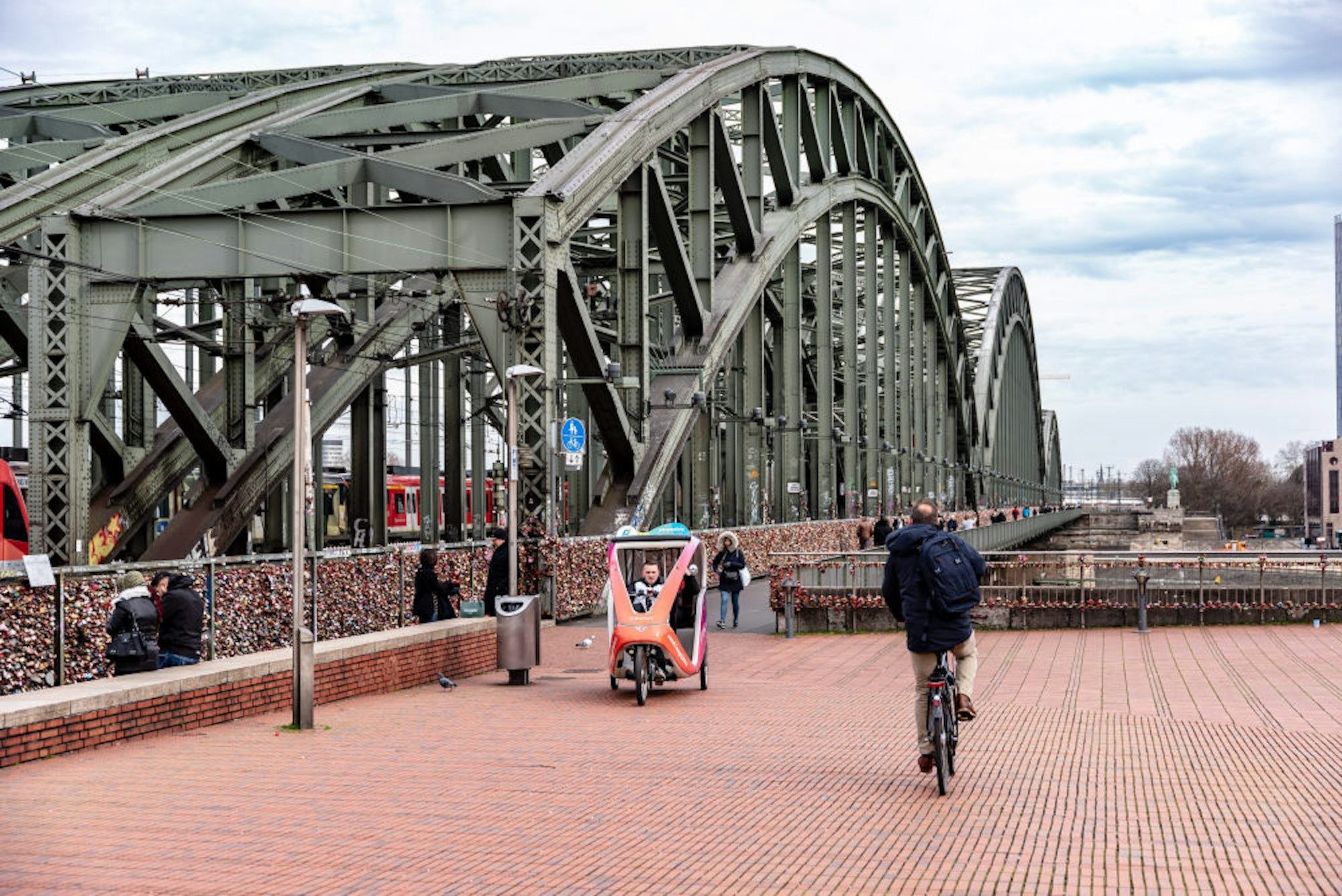 Auf der Hohenzollernbrücke kommen sich Radfahrer und Fußgänger oftmals ziemlich nahe.