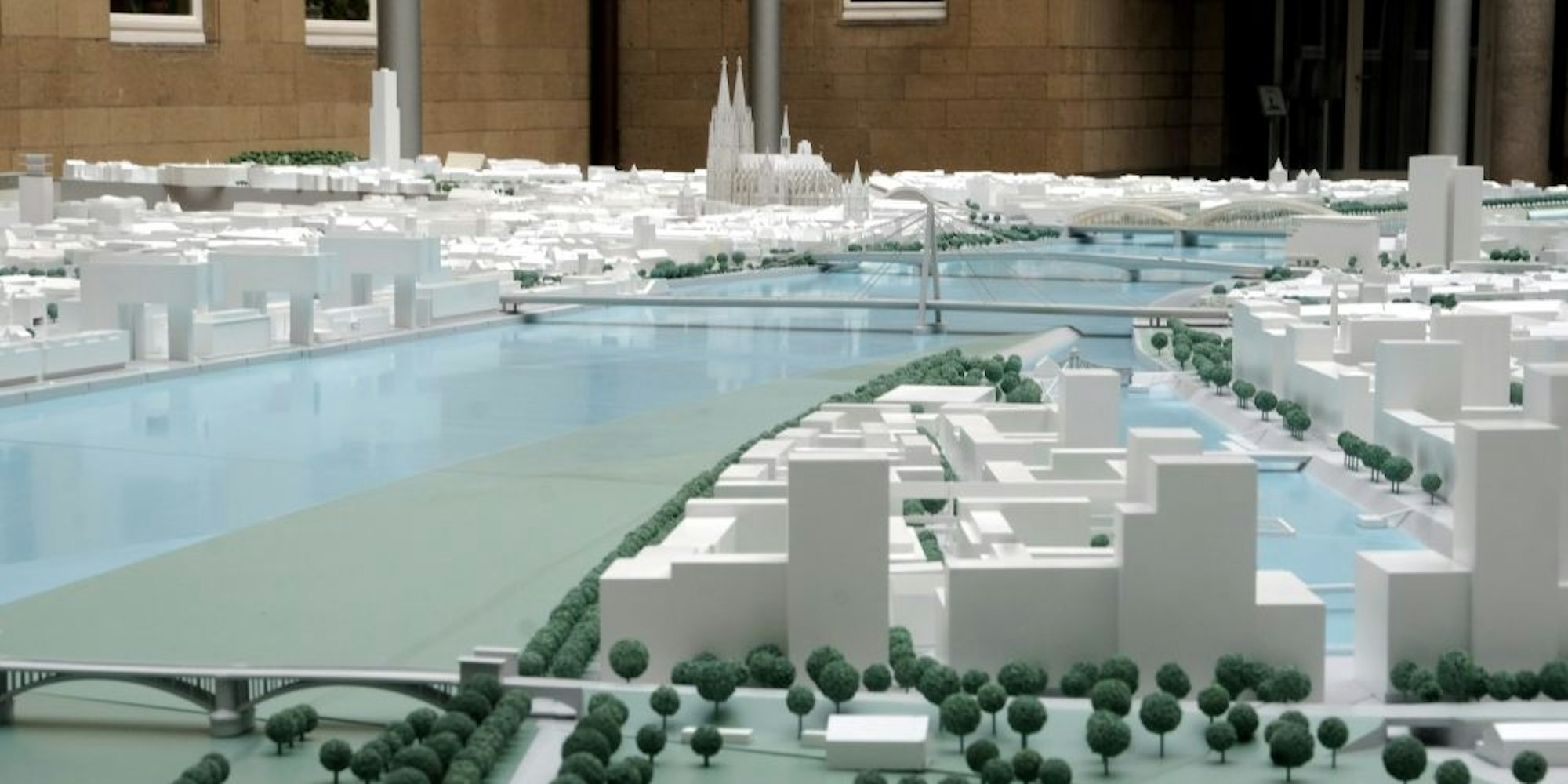 Köln – Die Türme des Doms schrumpfen auf eine Höhe von 31,4 Zentimeter, die Deutzer Brücke spannt sich 87 Zentimeter lang über den hellblau eingezeichnete Rhein. Im Maßstab 1: 500, den das im Rathaus aufgebaute Modell zur Grundlage hat, findet das Stadtzentrum auf einer Fläche von acht mal acht Metern Platz. Rheinauhafen, Volksgarten, Mediapark, Hauptbahnhof, Messe – alles vorhanden in Klein-Köln.