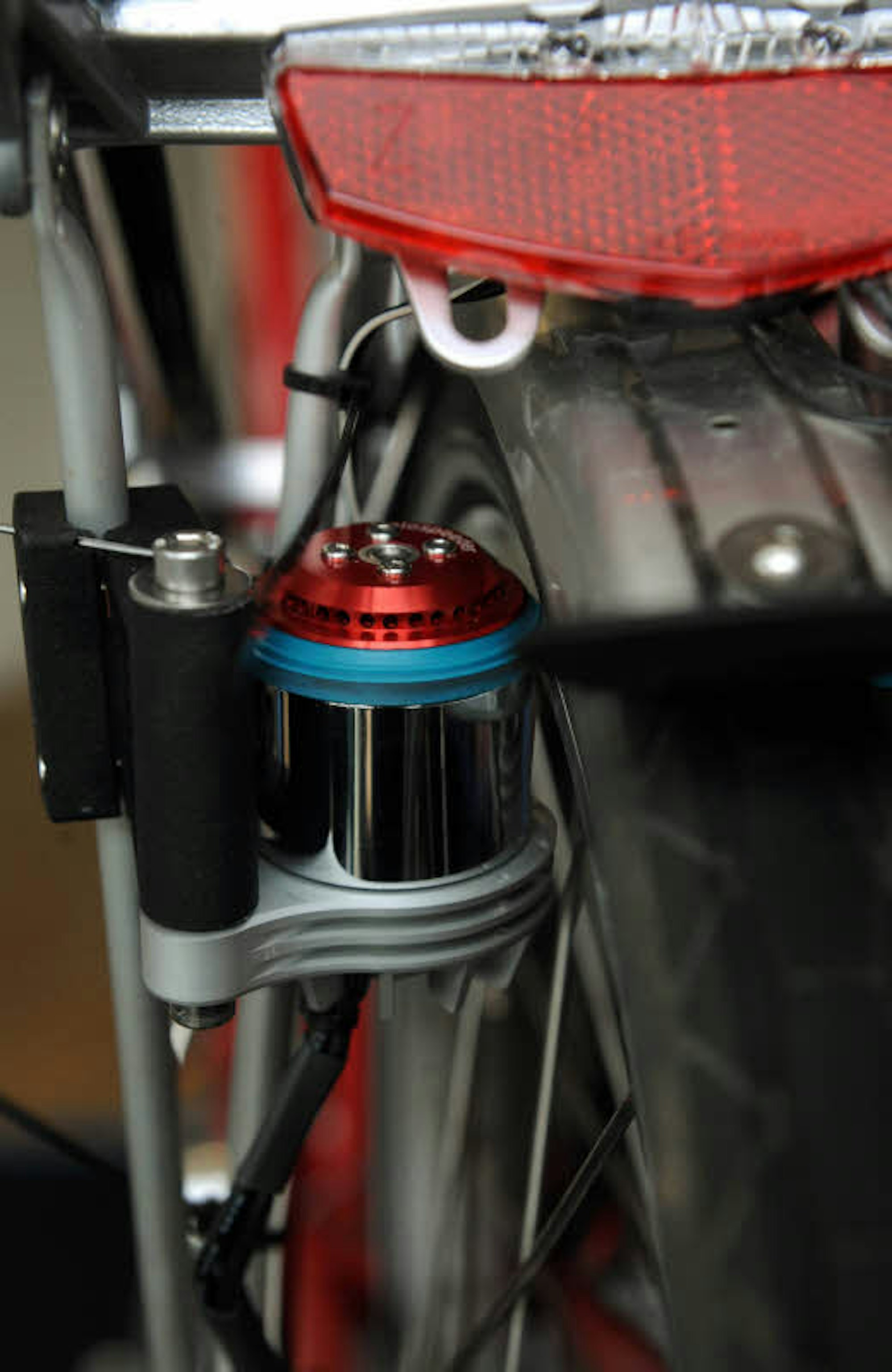Zuvor wird das 500 Gramm schwere Motorenpaar mit speziellen Halterungen am Rahmenrohr angebracht. „Diese Halterungen sind entscheidend. Sie werden für jedes Fahrrad individuell gefertigt, weil sie an den Rahmen angepasst werden müssen. So ist es möglich, die Motoren im exakt richtigen Winkel links und rechts auf die Hinterradfelgen zu bringen. Wichtig ist, dass beide Motoren gleichmäßig einen hohen Anpressdruck erzeugen. Jedes Bauteil wird durch fünf Parameter definiert und kundenspezifisch hergestellt“, erläutert Frieden.