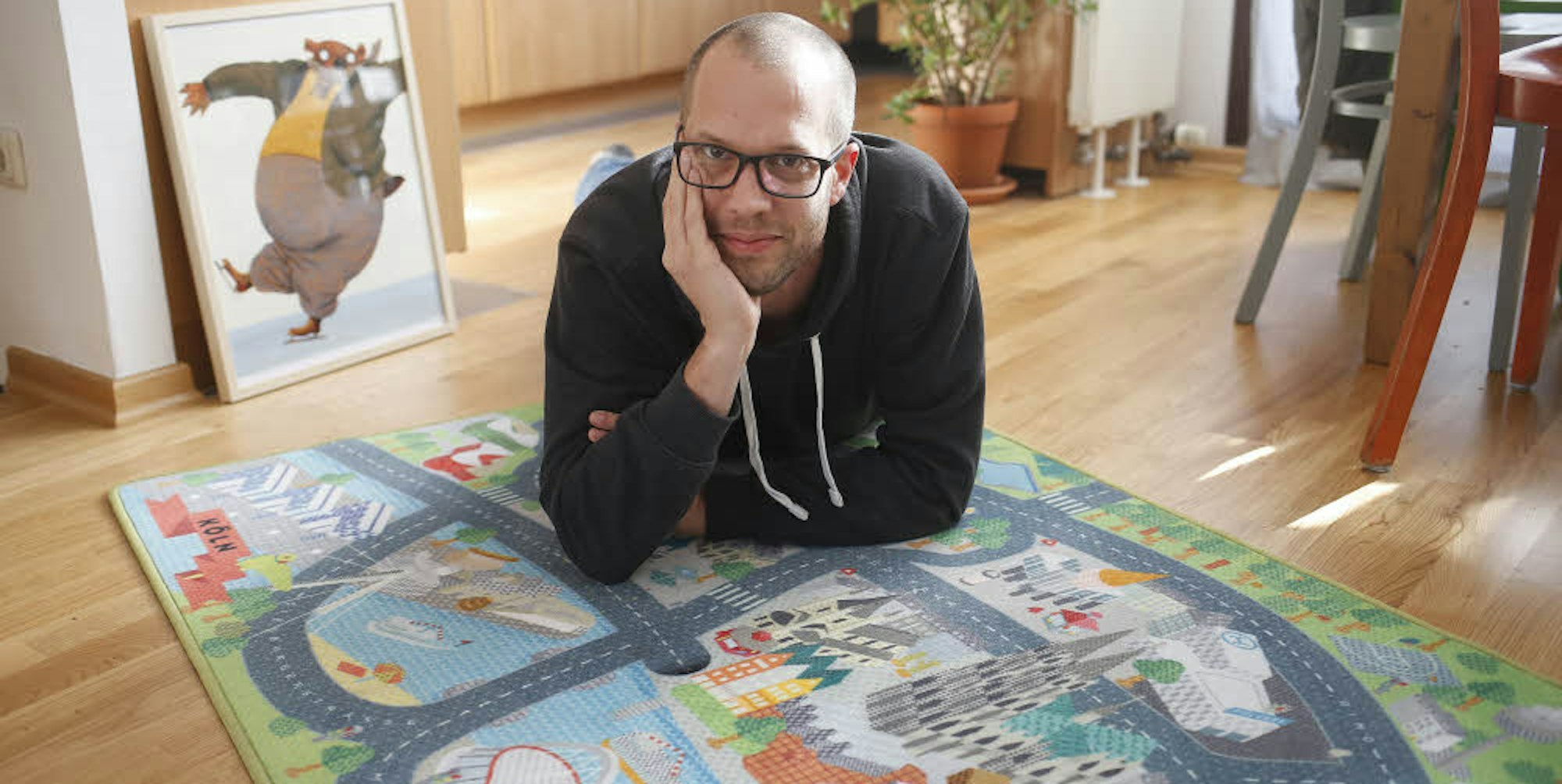 Matthias Schindlbeck auf dem Kinderteppich mit Köln-Motiven