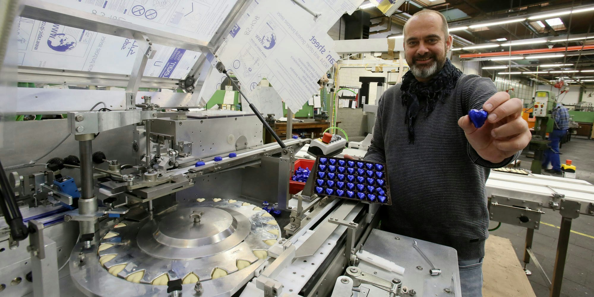 Finanzchef René Holdenried an einer Rasch-Verpackungsmaschine, die Schokoherzen verpackt.