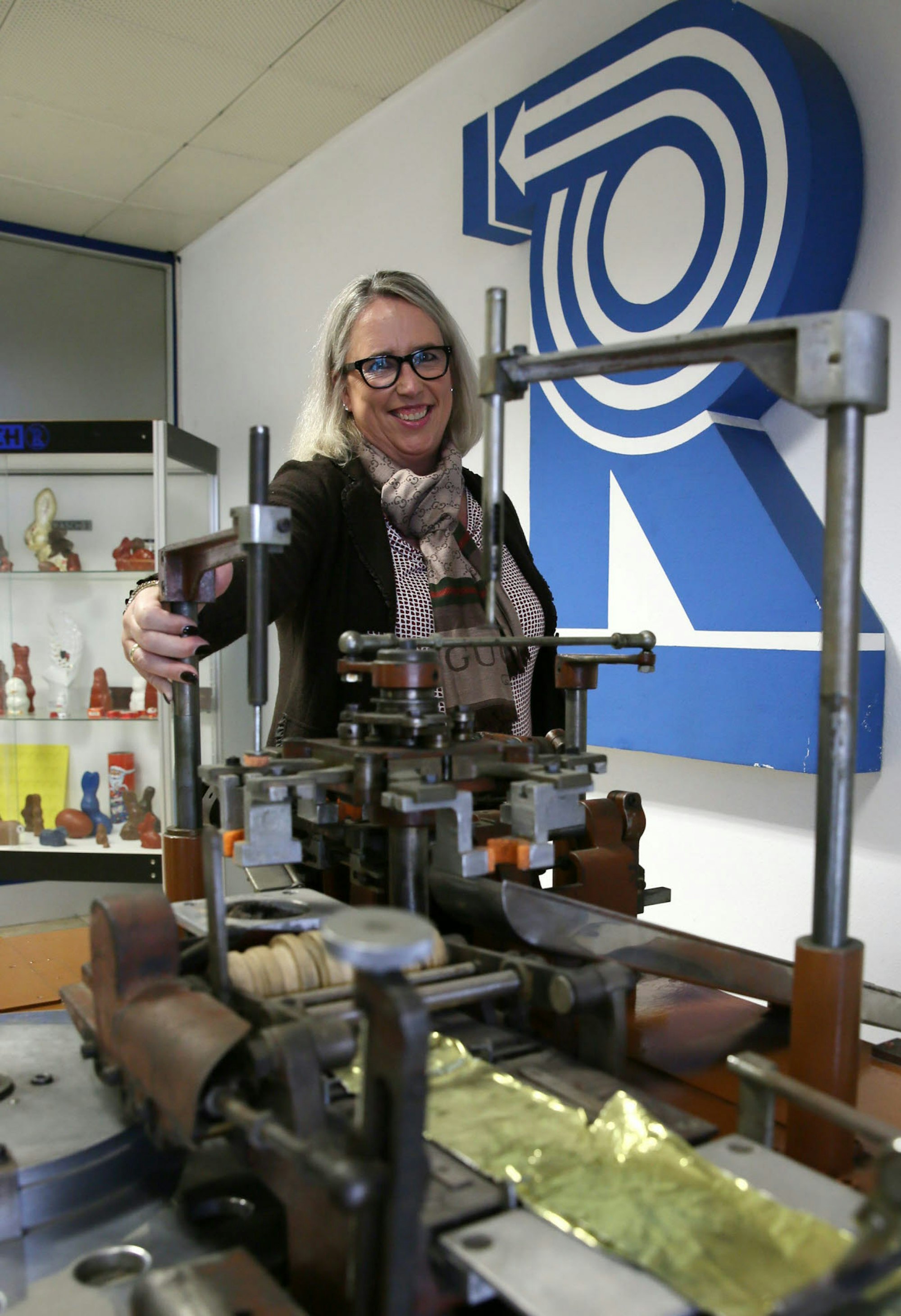 Tina Gerfer an der ersten Rasch-Verpackungsmaschine, Typ RP, aus dem Jahr 1952, die im Foyer der Firma an der Mathias-Brüggen-Straße steht.