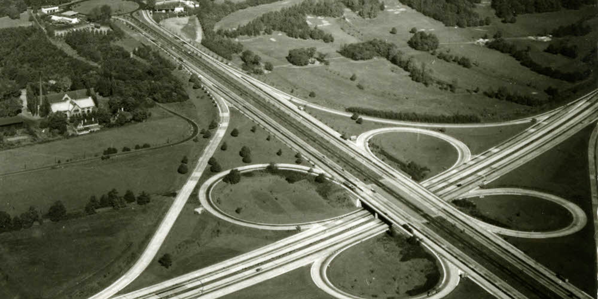 Das Kreuz Köln-Süd in den frühen 1960er Jahren. Auf der A555 ist noch die Landstraße zwischen den Spuren zu sehen.