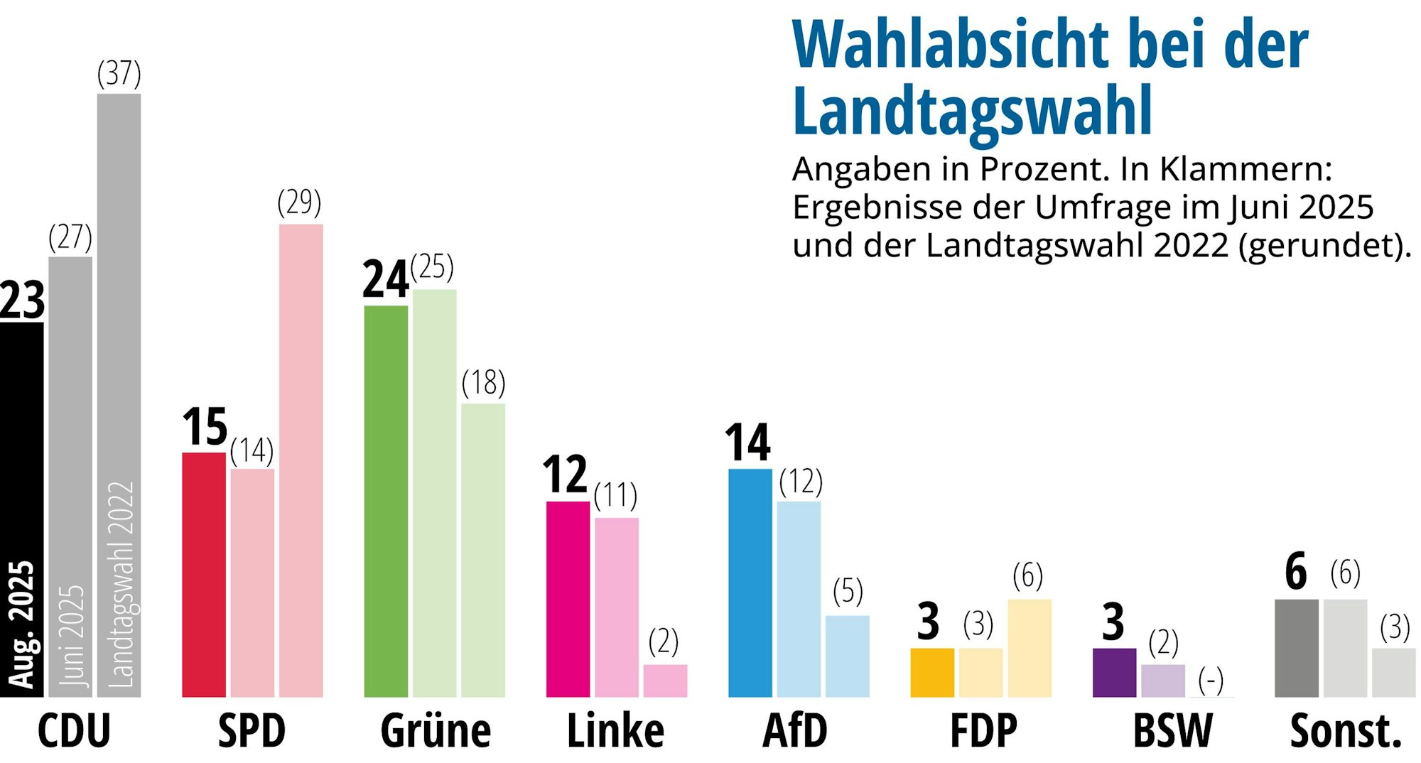 Beim Kräfteverhältnis der Parteien haben sich gegenüber der Umfrage vom Juni einige Verschiebungen ergeben. Die Grünen verlieren einen Prozentpunkt, behaupten aber mit 23 Prozent auf Stadtebene ihre führende Position in der Rangliste der Parteien. Mit einem Zwei-Punkte-Plus von 18 auf 20 Prozent löst die SPD auf Platz die CDU ab, die drei Prozentpunkte verliert und jetzt bei 17 Prozent liegt.