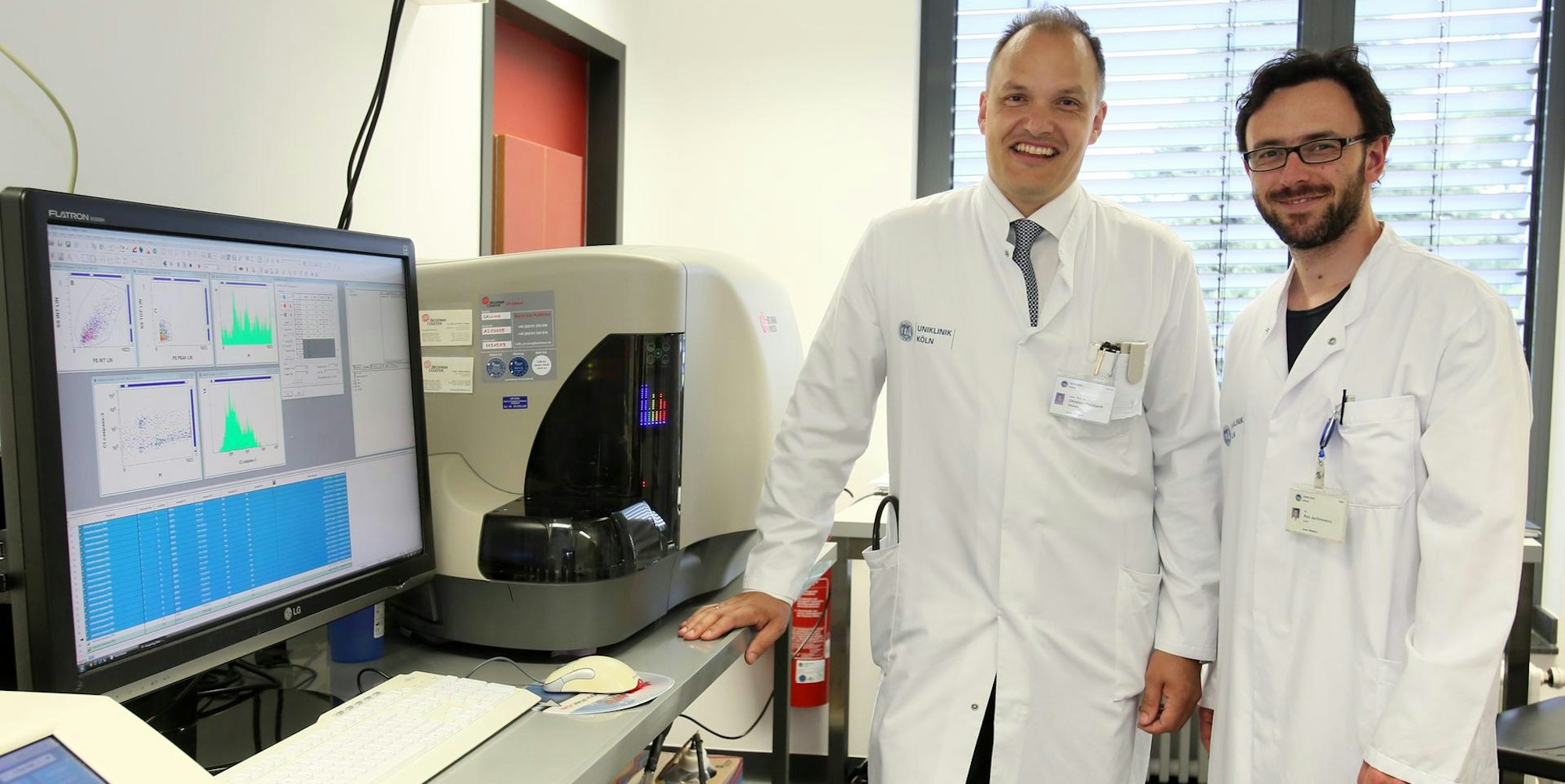 Die Mediziner Christian Reinhardt (l.) und Ron Jachimowicz in einem Forschungslabor des Centrum für Integrierte Onkologie (CIO) der Uniklinik Köln.