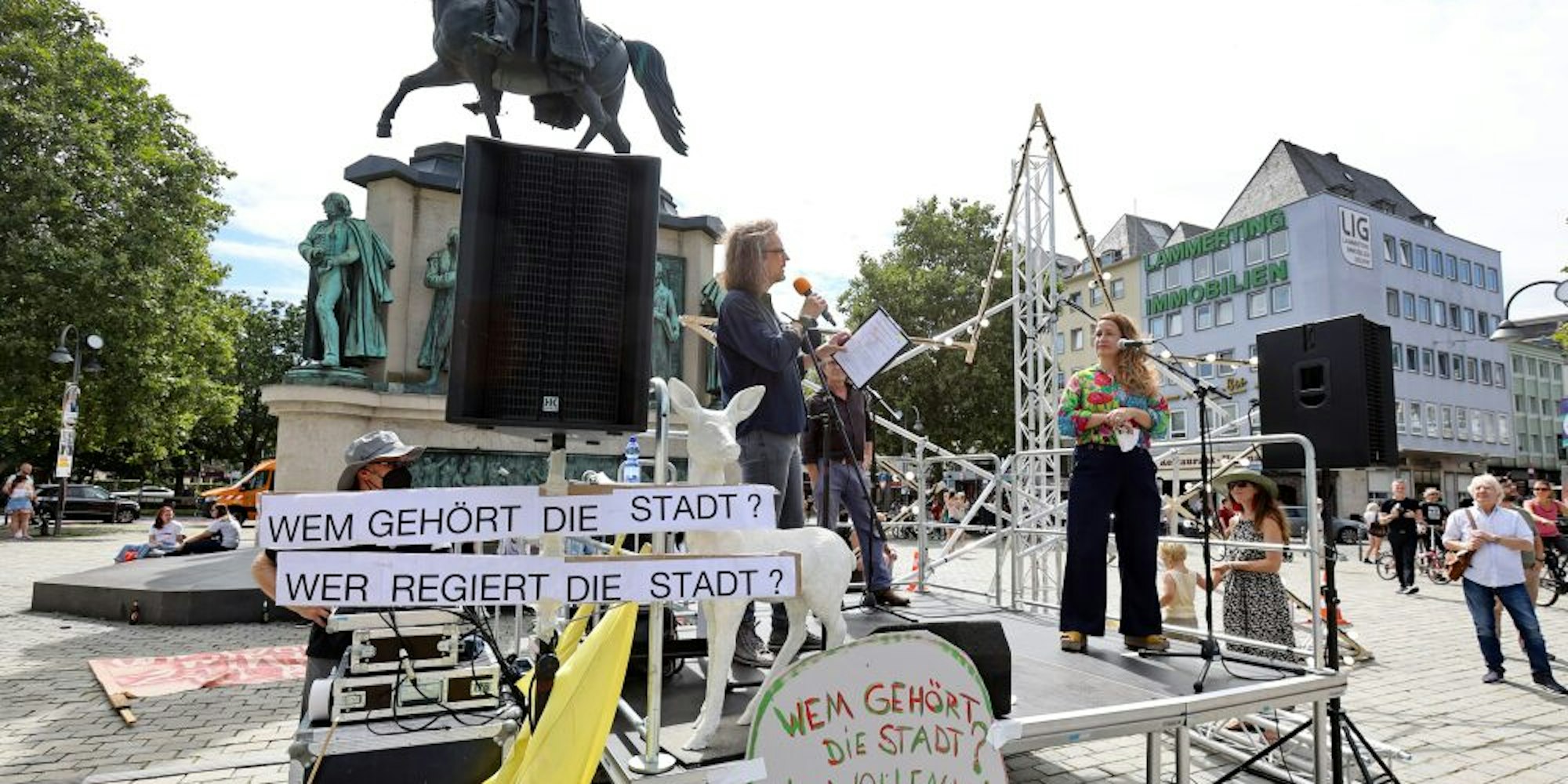 Die Vertreterin der SPD, Maria Helmis, und der Vertreter der Linken, Jörg Detjen, übten Kritik am Ratsbündnis. „Schwarz-grün muss sich durchsetzen“, so Detjen. „Was kann mehr wiegen als ein fraktionsübergreifender Ratsbeschluss?“, fragte Helmis. Er müsse endlich umgesetzt werden. „Macht es bitte“, so Helmis. Die Demo-Organisatoren hatten auf ein Plakat neben der Bühne die Frage geschrieben: „Wer regiert die Stadt?“ Alle Parteivertreter betonten die „einmalige Chance“, auf dem Areal in Mülheim neue Formen der Stadtentwicklungspolitik ermöglichen zu wollen. Alle stehen zu den getroffenen Beschlüssen – und doch werden sie bislang nicht umgesetzt.