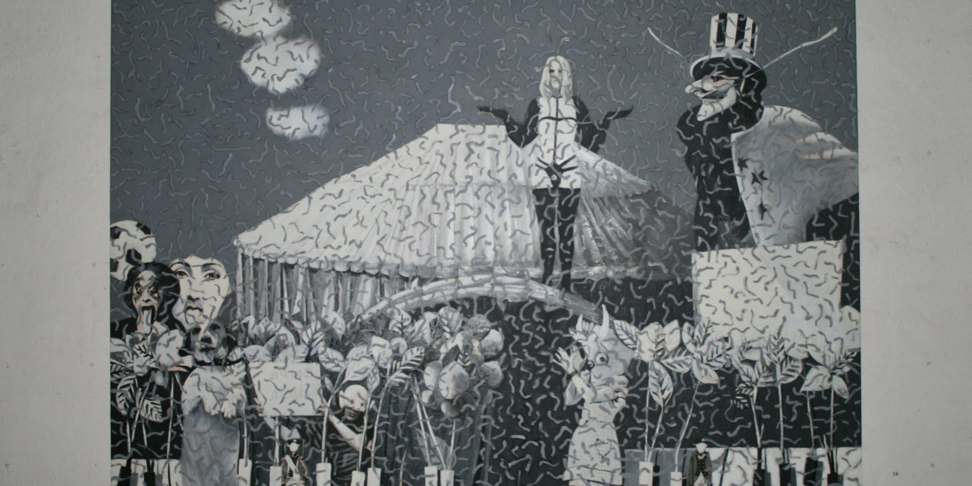 In der zweiten Bildserie schafft er mit einigen großformatigen, in Grautönen gehaltenen Gemälden zusätzlich eine Einbettung in die aktuelle Gegenwart und größere gesellschaftliche Zusammenhänge. Unfalltod, Flugzeugabstürze, Kriege sind unter anderen die Themen von Bildern, das die Menschen in einem absurden Schauspiel aus Lust, Gewalt, Eitelkeit, Komik, Gefräßigkeit, Zerstörung und Lächerlichkeit zeigt. Viele Worte macht Alker nicht. "Die Bilder erzählen alles," sagt er.