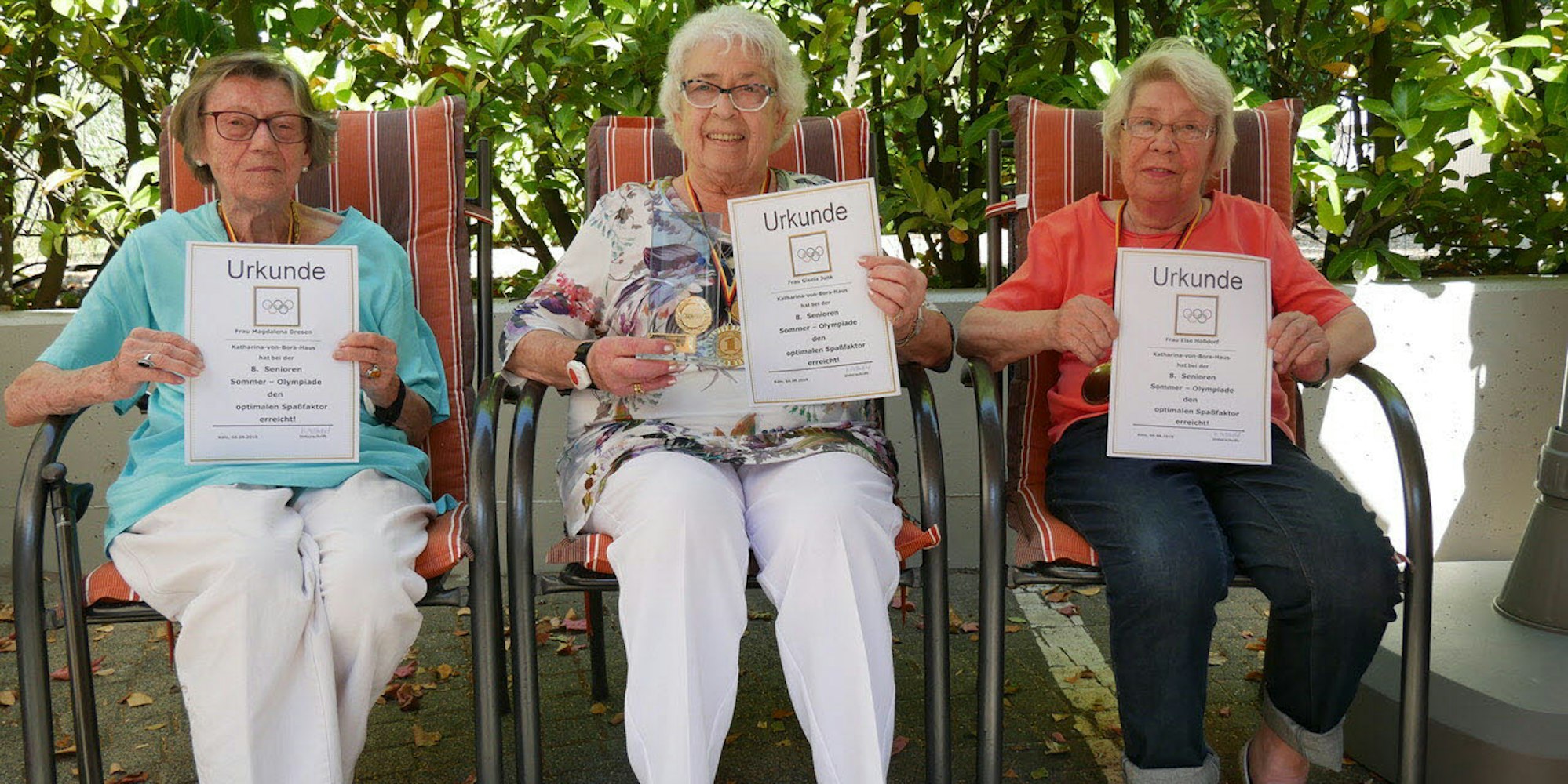 Die Olympiasiegerinnen: Die Silbermedaille geht an Magdalena Dresen (v.l.), 95, Gold holt Gisela Junk, 84, und die Bronzemedaille erringt Else Hoßdorf, 83.