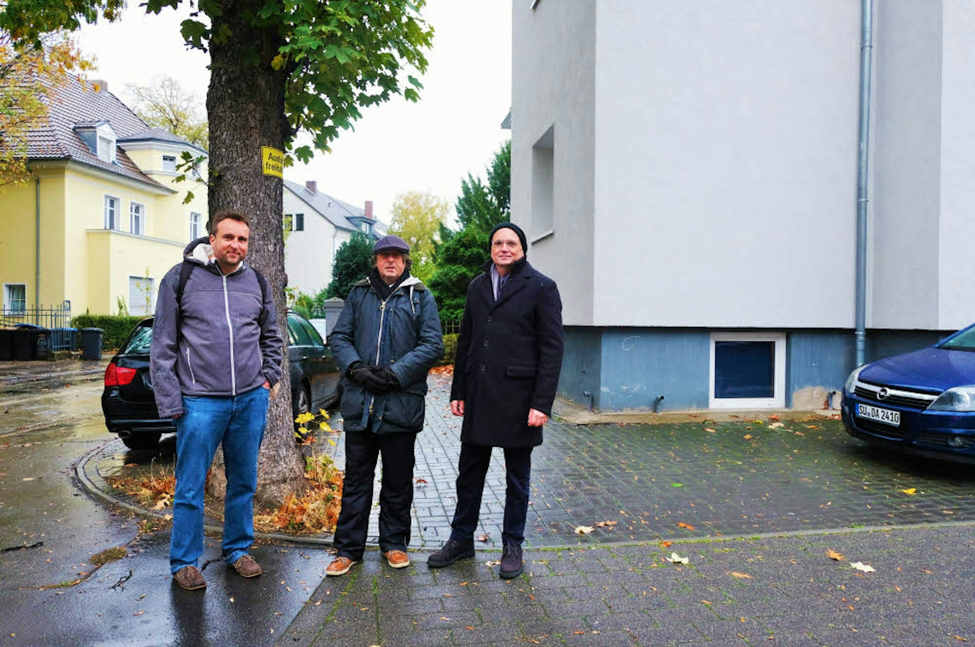 Florian Weber-Baranowsky, Roland Schüler und Reinhard Zietz (v.l.) beklagen, dass immer mehr Vorgärten in gepflasterte oder betonierte Stellplätze gewandelt werden, wie hier im Stadtteil Lindenthal.
