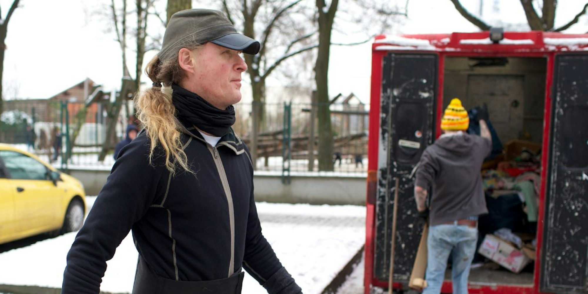 Der Wagen ist Kult, jeder kennt ihn in Lindenthal. Ein erdbeerroter Transporter von 1989. In der Fahrerzelle grüßen Nina Hagen, Dennis Hopper und Hans Albers von Fotos. Pfannenheber, Fleischerhammer, Messerschärfer und Plastikweihnachtsmann schmücken die Ablagen. „Tagelöhner und Troubadure auf Coollanz“ und „Der Omagnet“ ist mit Filzstift in den Innenraum gekritzelt. Am Seitenfenster sind außen Visitenkärtchen mit Handynummer und Hansens Firmennamen „Der Aufräumer“ eingeklemmt. Mehr Werbung macht Hansen, der in Kalk aufgewachsen ist und seit 26 Jahren in Lindenthal lebt, nicht. „Ich sehe mich als Romantiker in der Tradition der Fuhrleute“, sagt er. Lange ist er zu Mittelalterfesten in ganz Europa gereist, um in Kampfmontur alte Schlachten nachzustellen. Inzwischen fährt er mit seiner Harley Davidson, Baujahr 1952, am liebsten „einfach raus, immer der Nase nach“. Ein anderer Tag, ein anderer Haushalt im Bauch des roten Wagens. Hansen fährt mit 60 Km/h über die Autobahn, ein Pkw-Fahrer macht den Handscheibenwischer. Ziel ist das „Entsorgungscenter“ in Gremberghoven – Hansen fährt öfter zur Müllkippe als zur Tankstelle.