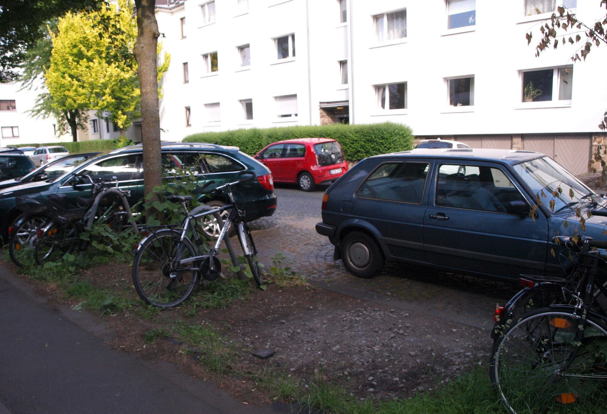 Er glaube nicht, dass viel Parkraum verloren geht, wenn die Pkw vorschriftsmäßig abgestellt werden. Schließlich engten Bäume und Wurzeln eh die Abstellfläche ein. „Meiner Meinung nach kommt man bei beiden Arten zu parken auf die gleiche Anzahl von Stellplätzen.“