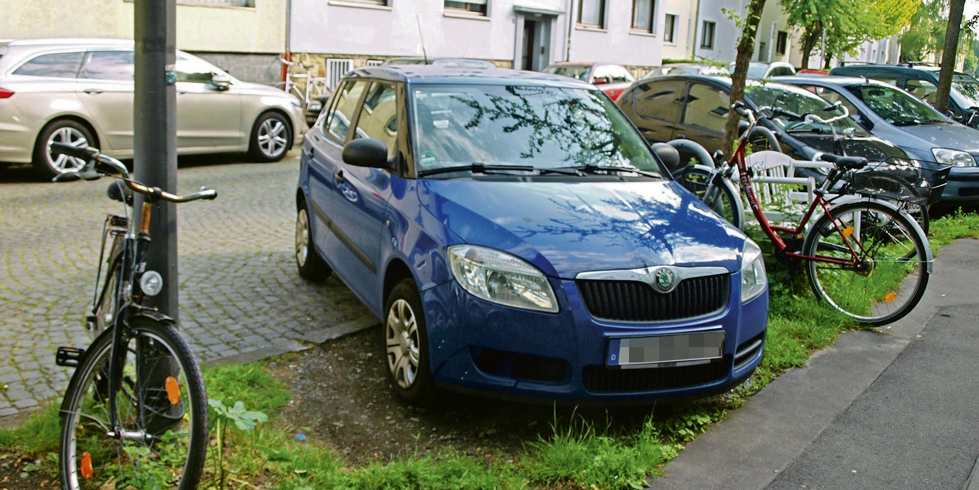 Köln-Sülz – An einer Stelle wuchert noch Unkraut fast bis auf Höhe der Kühlerhaube des geparkten Autos. Es wirkt wie ein Kräftemessen zwischen dem letzten verbliebenen Grün und den Fahrzeugen, die es niederdrücken. Doch die Natur hat gegen die Blechlawine keine Chance. Was einmal ein Grasstreifen war, ist mittlerweile gepresste Erde, aus der hier und da ein paar Wurzeln ragen.