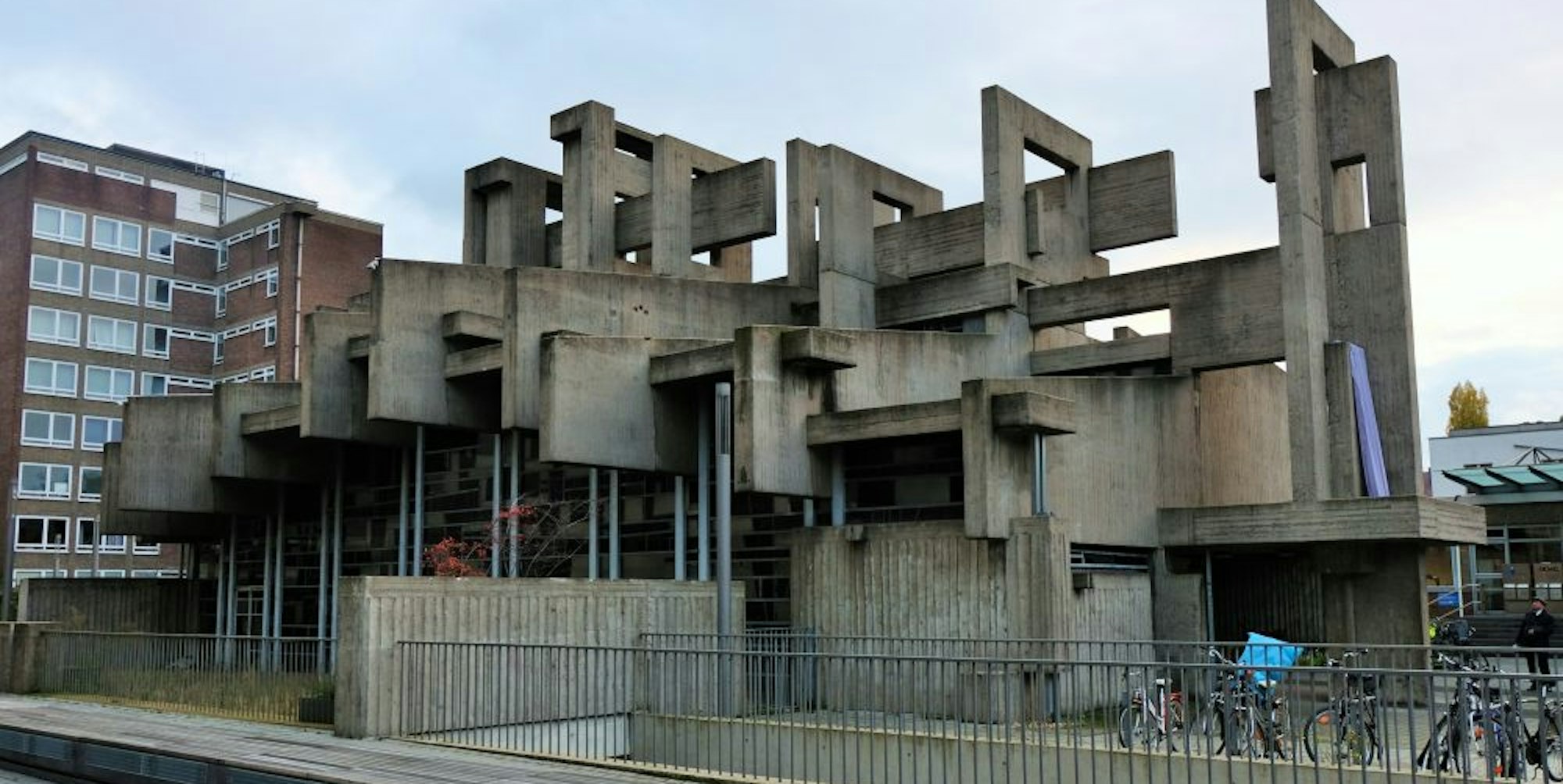Die Kirche Heiliger Johannes XXIII. der katholischen Hochschulgemeinde wurde in den Jahren 1967 bis 1969 gebaut, im damals angesagten Stil des Brutalismus. Der Begriff, abgeleitet von dem französischen Ausdruck „béton brut“ für „roher Beton“, beschreibt den bevorzugten Werkstoff des französischen Architekten und Designers Le Corbusier – und nicht etwa „brutale“ wuchtige Bauweise, wie manchmal vermutet wird.