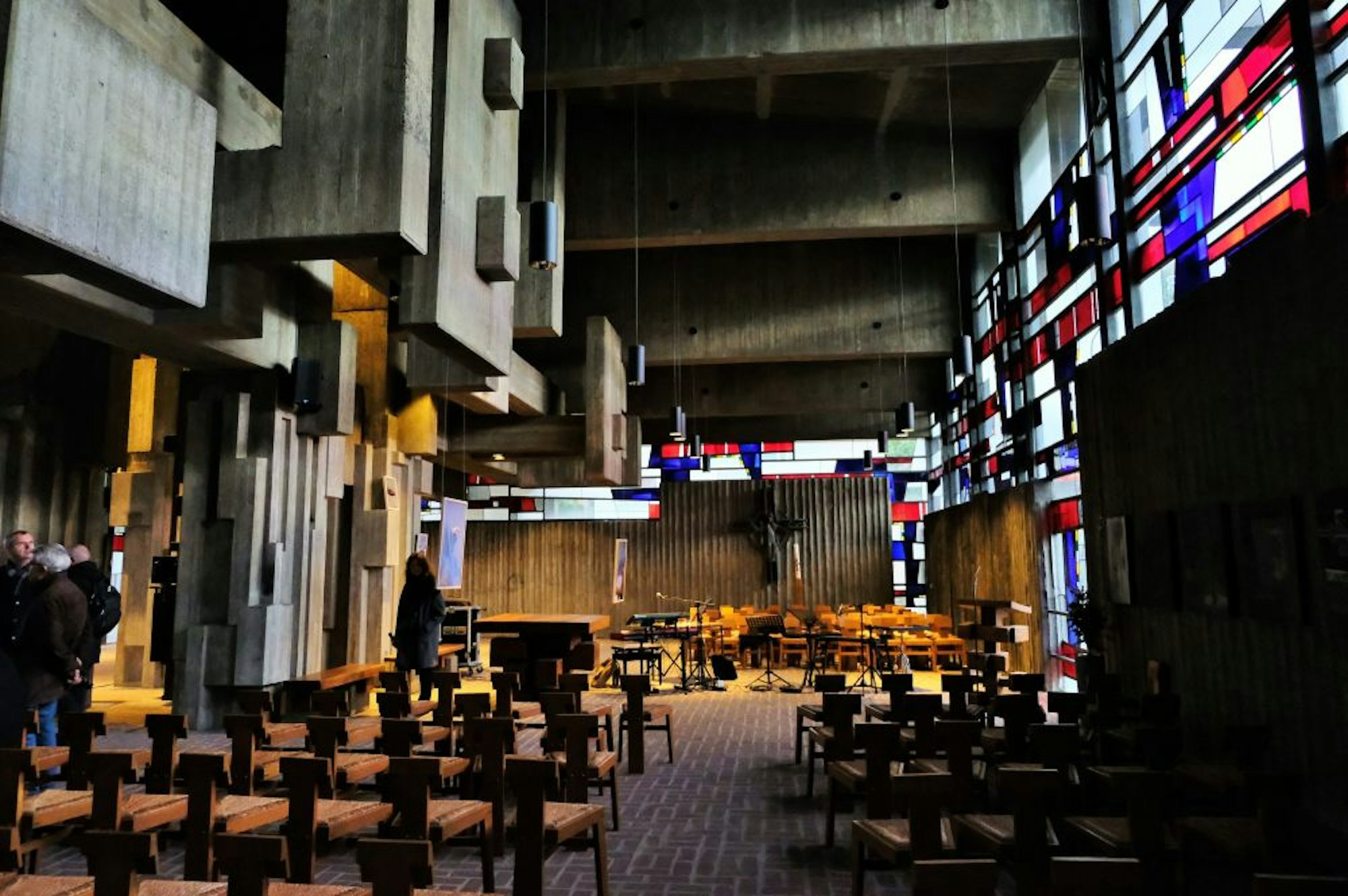 Rot, blau, weiß und durchsichtig durchbricht die große Glasfläche die Betonwände. Zwei turmartige Vorbauten im Norden und im Süden ergänzen den Bau, der laut Thomas van Nies beides ist: Architektur und begehbare Plastik. Historiker Josef van Elten rundete die Erläuterungen mit Erzählungen zur Entstehungsgeschichte der Kirche ab. „Um 1962 hatte der Hochschulpfarrer Wilhelm Nüssen Erzbischof Frings gesteckt, das ginge so nicht weiter“, erzählte er, „ohne Zentrum könne er nichts machen, er bräuchte Versammlungs-, Büro- und Musikräume.“ So entstanden auf dem ehemaligen Trümmergrundstück die Aula, das Studentenzentrum und zwei Wohnheime und dann auch noch die Kirche.