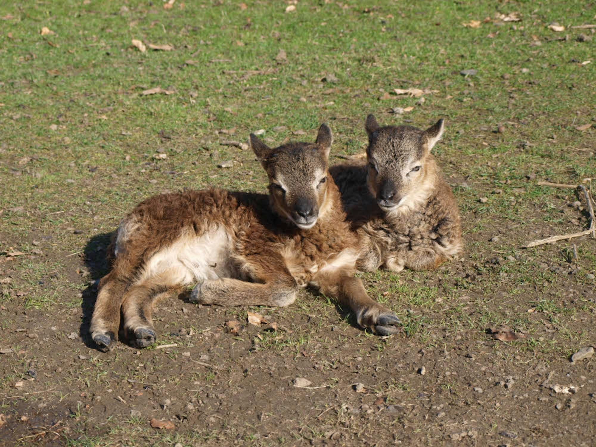 Ein Soay-Lämmchen-Zwillingspaar sonnt sich auf der Wiese im Lindenthaler Tierpark.