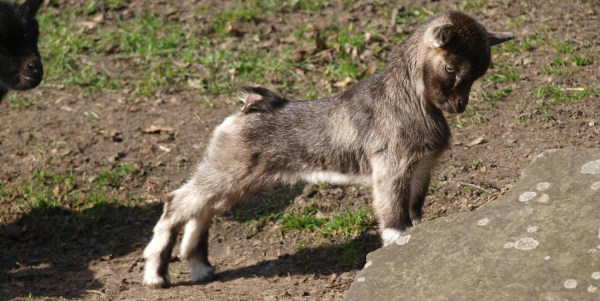 Klein, aber schon richtig bockig, zeigt sich ein neugeborenes Zicklein im Lindenthaler Tierpark.