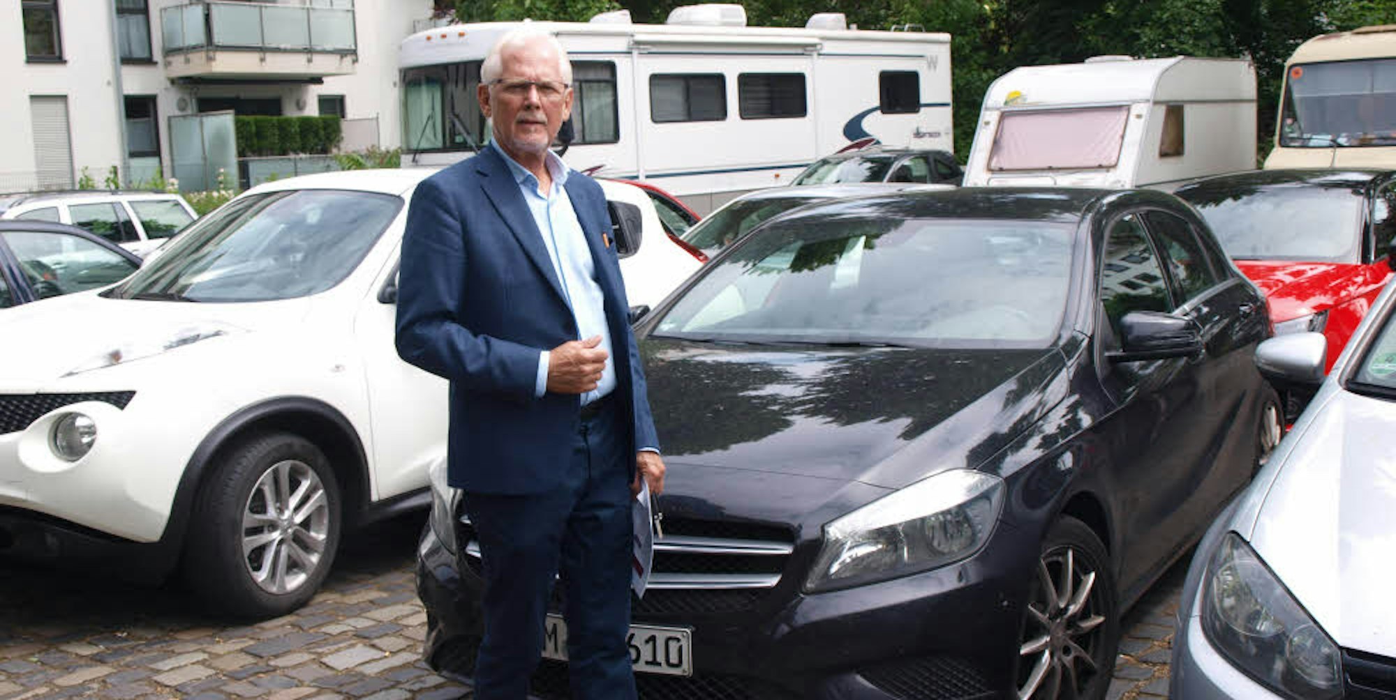 Josef Terfrüchte, ehemaliger Geschäftsführer der Genossenschaft Kölner Friedhofsgärtner, Initiator der Bestattungsgärten, einer neuen Form von Urnengräbern auf dem Melatenfriedhof, und Vorsitzender des Senioren-Servicedienstes Köln, kennt den Ort wie seine Westentatsche – und den Grund für die Parkplatznot. „Die Mitarbeiter der benachbarten Bürogebäude wie der Finanzverwaltung oder der Europaversicherung kommen morgens und fahren erst abends wieder weg.“
