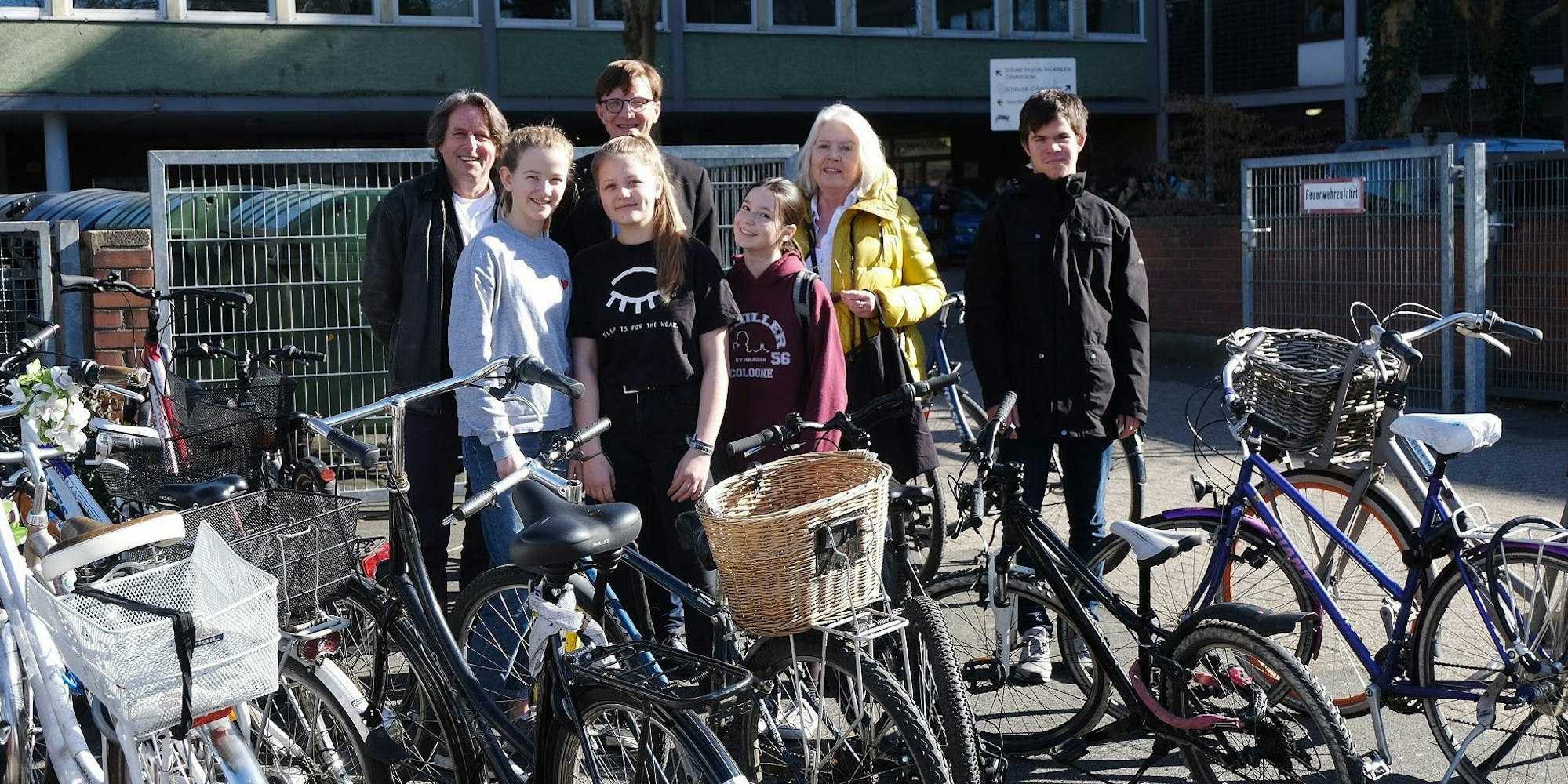 Roland Schüler, Geog Scheferhoff, Helga Blömer-Frerker, Paul Katenbrink (hinten v.l.) und drei Schülerinnen von der Schülervertretung des Schillergymnasiums vor dem Schultor, wo eine Menge Fahrräder wild geparkt sind.