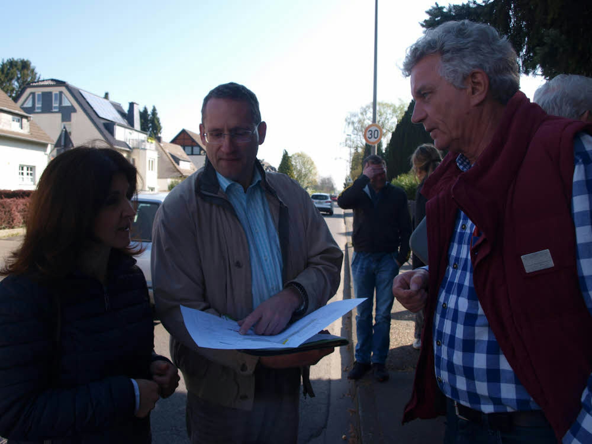 Auch wenige Hundert Meter weiter ist Sicherheit von Fahrradfahrern das Thema. Die Brauweilerstraße schlängelt sich zwischen Spitzanger Weg und Kölner Straße als enger Asphaltpfad durch den alten Ortskern. „Hier fehlt ein Schutzstreifen für Radfahrer. Sie weichen regelmäßig auf die Bürgersteige aus, um vor den Autos sicher zu sein“, sagt Manfred Stitz. „Ich habe schon gesehen, wie Radler Menschen, die aus den Häusern treten, über die Füße fahren.“ Die Experten der Verwaltung überlegen: „Die Fahrbahn muss 4,50 Meter breit sein, damit man einen Schutzstreifen von 1,50 Breite anlegen kann“, erläutert Lemke. Wenn auf der Straße Busse verkehren, seien sogar fünf Meter nötig. Das müsse man genau ausmessen.