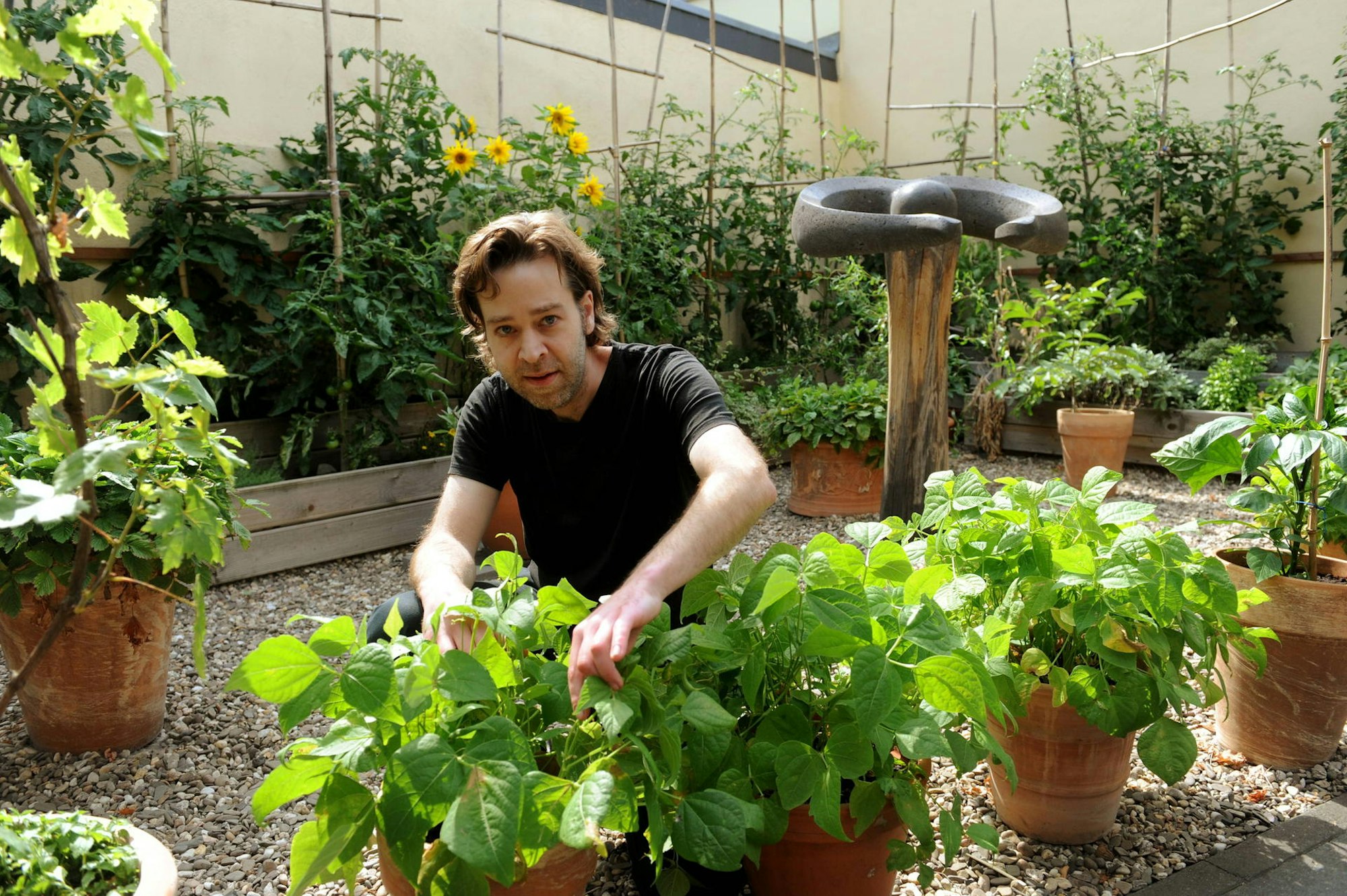 Inzwischen steckt wohl auch ein kleines Vermögen in Terrakotta-Töpfen, aus denen etwa leuchtend orangefarbene Kapuzinerkresse wuchert oder der Oleander emporwächst. Er sei täglich anderthalb Stunden mit dem Wässern und Pflegen von Bohnen, Stachelbeeren, Erdbeeren, Olivenbäumchen sowie etlichen Kräutern beschäftigt.