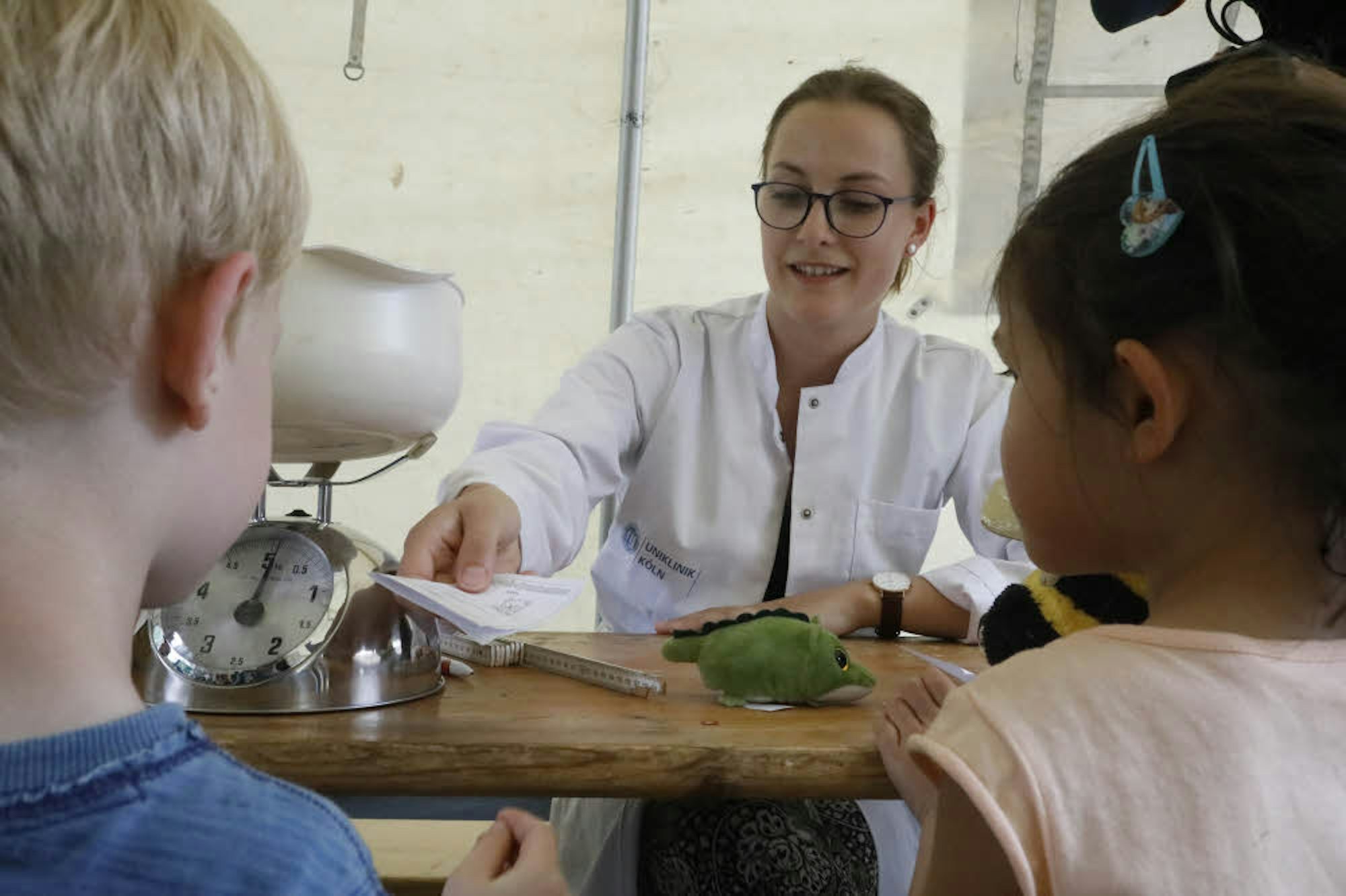 In mehreren Zelten sind verschiedene Krankenhaus-Stationen aufgebaut: Bei der Anmeldung erfragen die angehenden Ärzte die Symptome der Kuscheltiere. „Gecko hat Husten. Ganz schlimmen.“ sagt der fünfjährige Phillip. „Dr. ted.“ Laura Hero wiegt und misst die grüne Echse, trägt alles in den Teddybär-Pass ein: 80 Gramm, 15 Zentimeter, Fellfarbe grün. „Ich bin früher selbst mit meinen Kuscheltieren ins Teddy-Krankenhaus gekommen“, sagt die 20-Jährige. Inzwischen studiert die Kölnerin im sechsten Semester Medizin. „Ich könnte mir gut vorstellen, später als Kinderärztin zu arbeiten“, sagt sie.