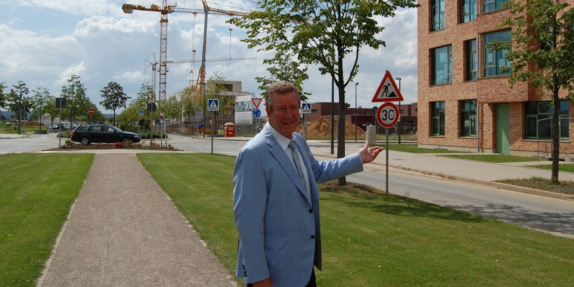 Norbert Amand steuert seinen Mercedes durch einen der Kreisverkehre auf dem breiten Boulevard Unter Linden. Fast jeder Meter der noch unfertigen Straßen – die letzte Deckschicht wird erst aufgebracht, wenn das schwere Gerät verschwunden ist – hat seine eigene Geschichte. Amand kennt sie alle. Die vom Hausbesitzer an der Grenze zum Neubaugebiet, dessen Grundstücksgrenzen nicht korrekt im Kataster eingetragen waren. Amand kaufte den fehlenden Streifen, errichtete einen Zaun und eine Hecke. Und jene von den ersten Bewohnern, die 2007 am Mathesenhofweg ihre Holzhäuser bezogen, als ringsherum kein einziges Haus stand. „Sie haben mir ein bisschen Leid getan“, sagt Amand.