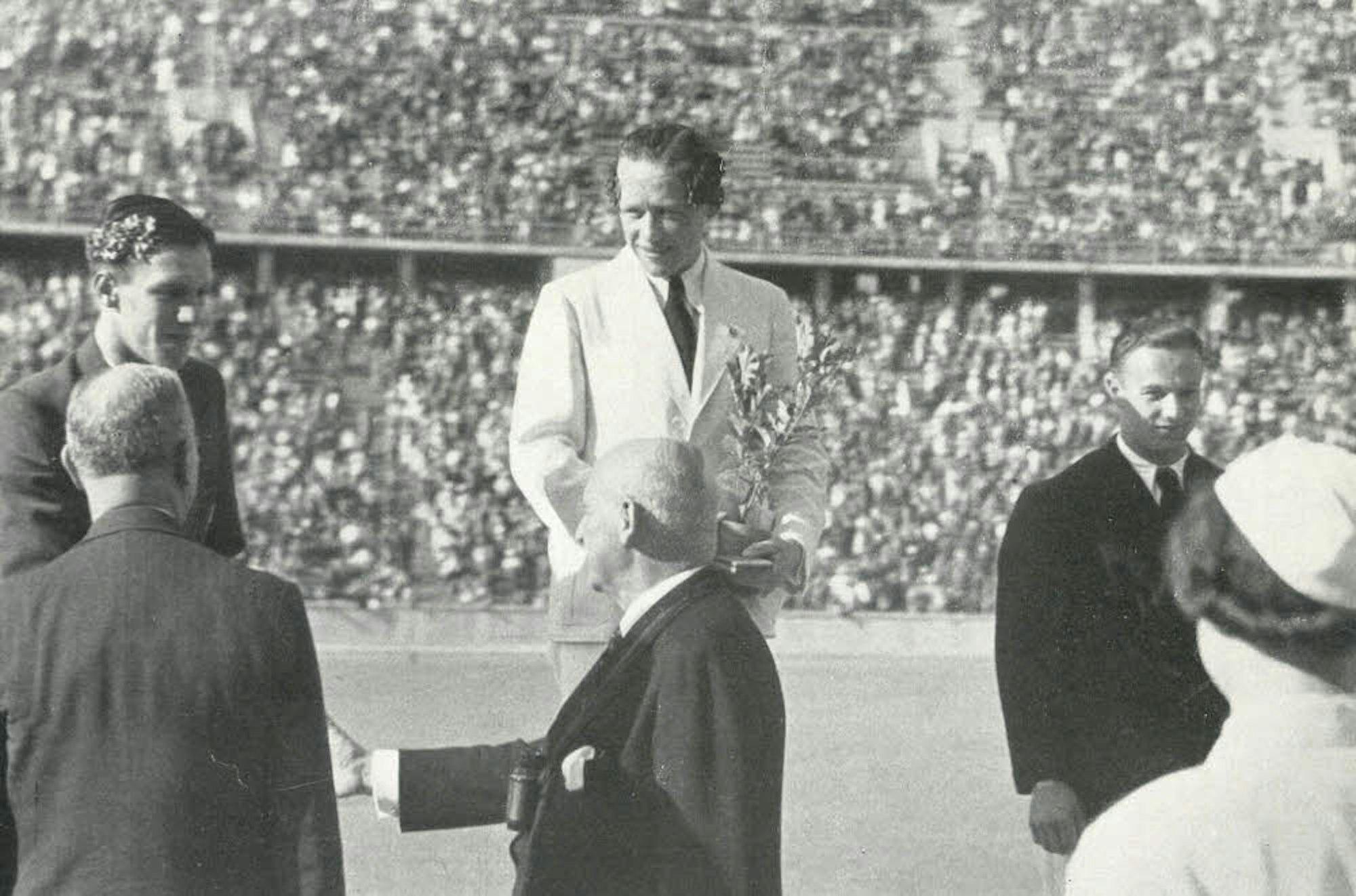 Toni Merkens (Mitte) bei der Siegerehrung im Berliner Olympiastadion. In der Hand hält er den Eichen-Setzling, den er zusätzlich zur Goldmedaille überreicht bekam.