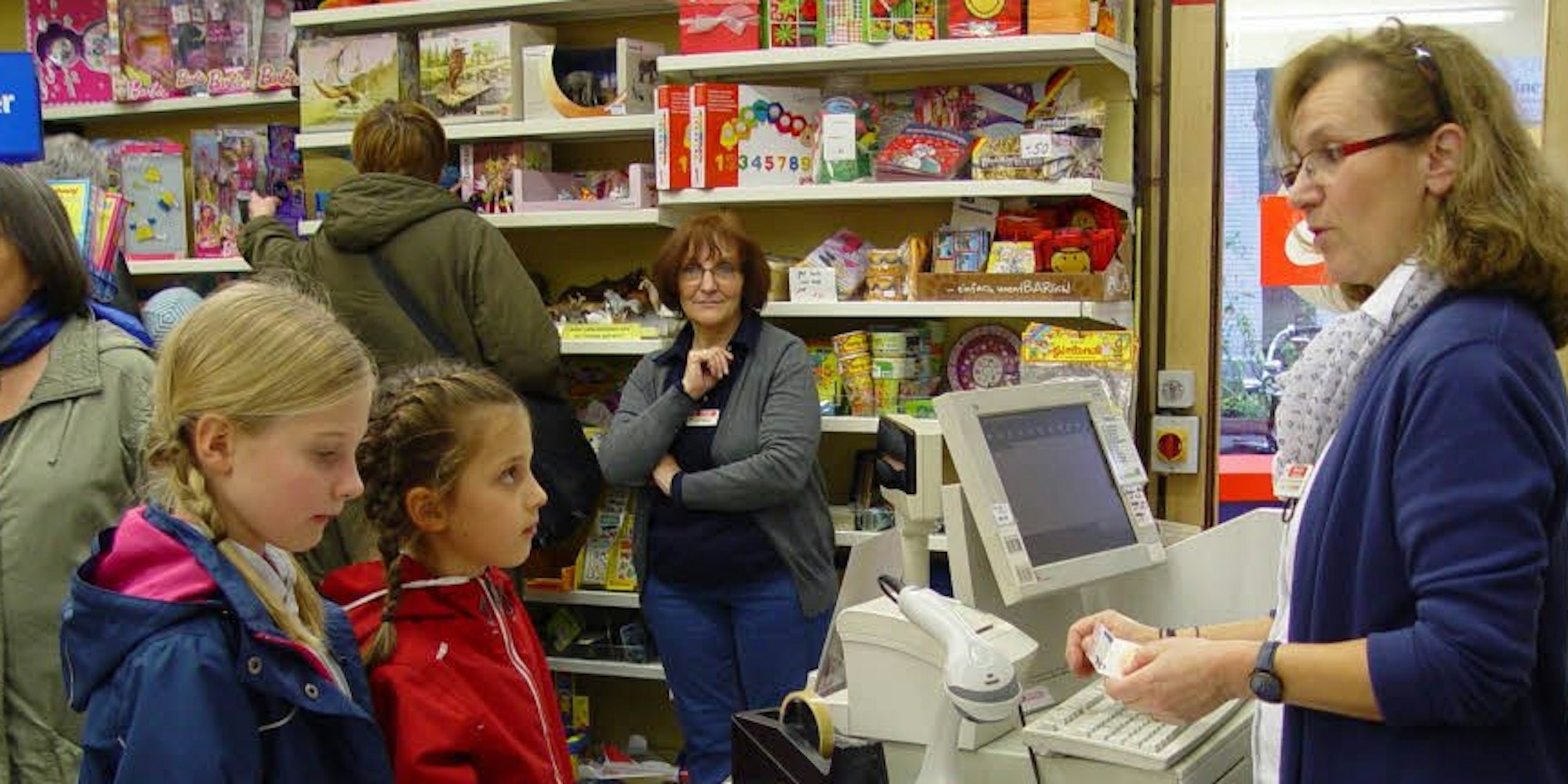 Sophia und Paulina lassen sich von Inhaberin Karin Koeppen (r.) erklären, warum der Laden schließen muss.