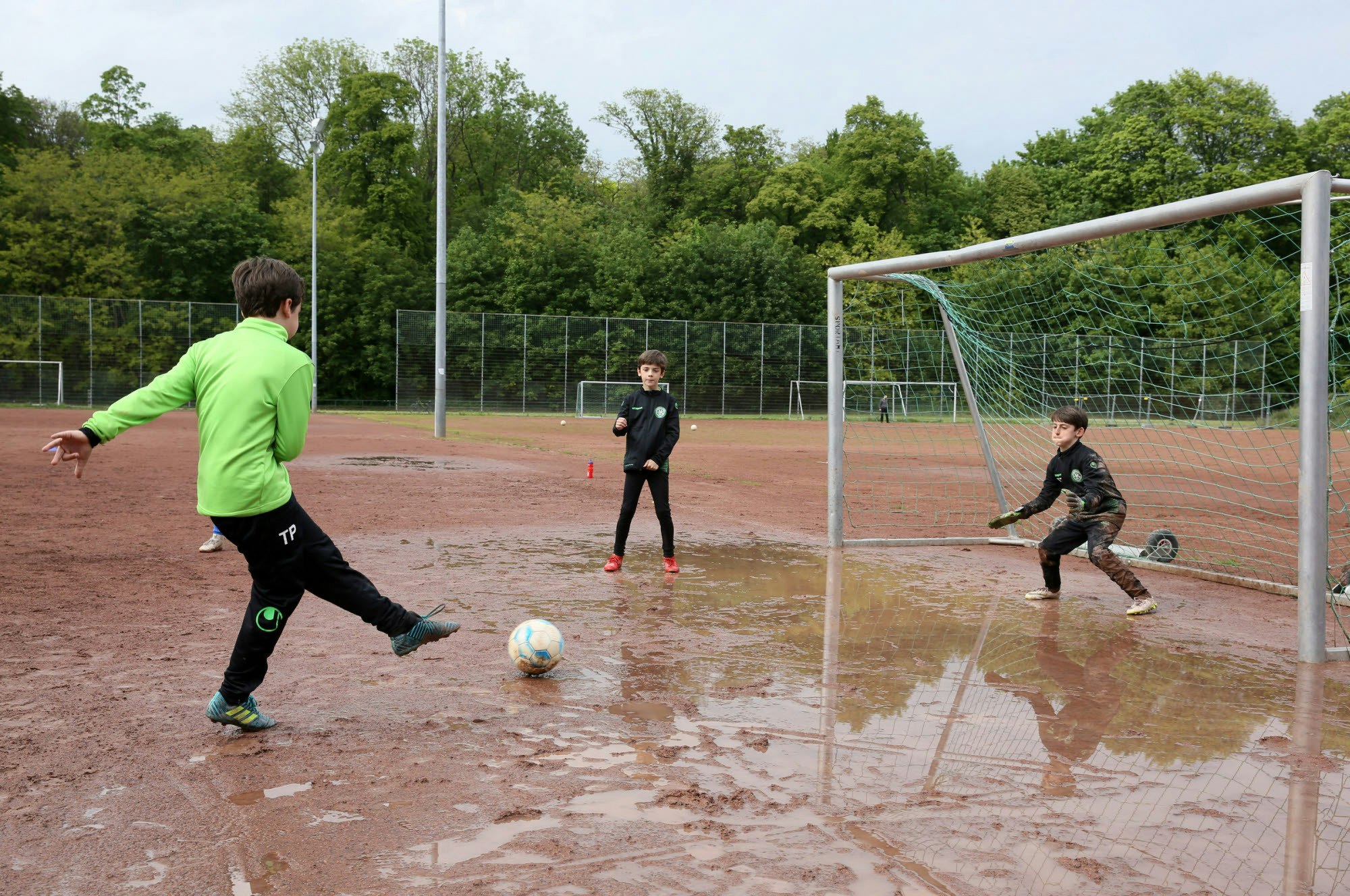 Nichts für Zartbesaitete: Torwart Erald und seine Mitkicker sind schon in den ersten Trainingsminuten vom Schlamm durchweicht.