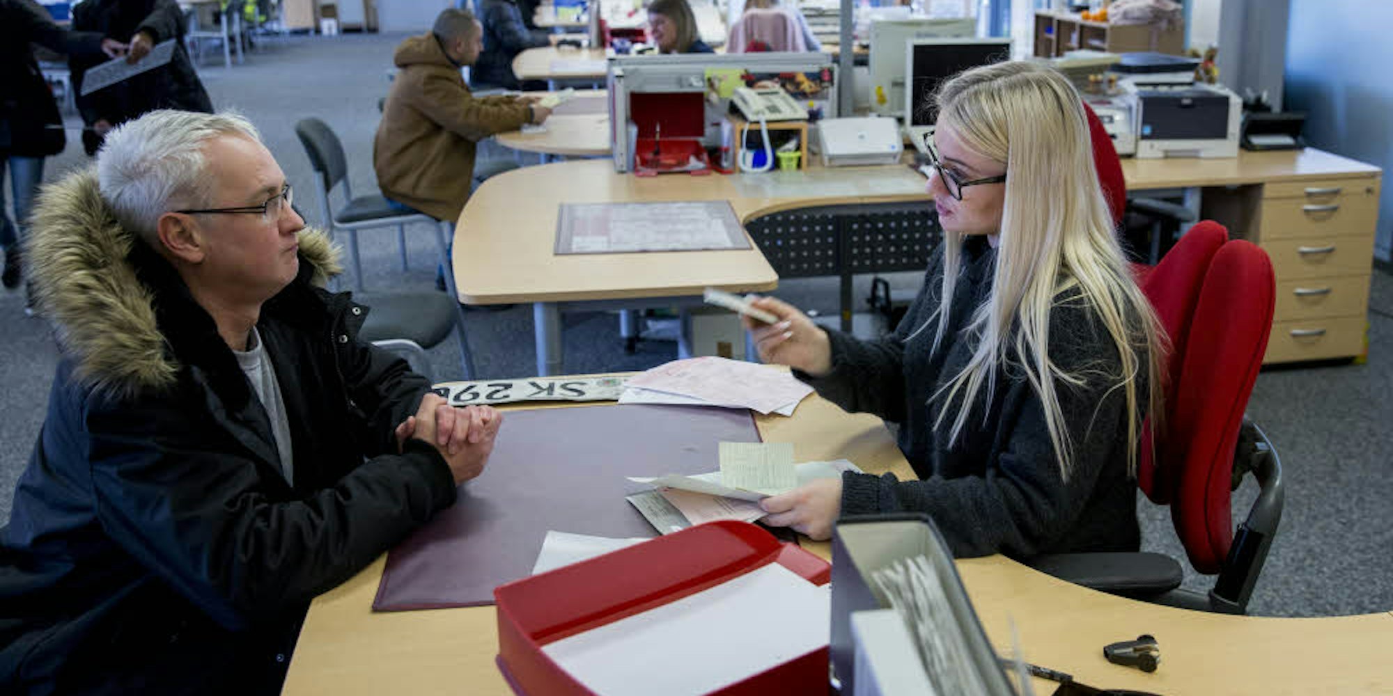 Ulviye Kilic prüft mit routiniertem Blick die Unterlagen, die mitzubringen sind, wenn Autos um- oder abgemeldet werden, Kfz-Scheine umgeschrieben oder gestohlene Kennzeichen gemeldet werden müssen. Und das im Minutentakt: 2018 wurden rund 150.000 Kunden in der Zulassungsstelle an der Max-Glomsda-Straße 4 in Poll abgefertigt, das sind etwa 500 pro Tag. Die Schlange vor Ulviye Kilic’ Theke reißt selten ab. Wenn sie grünes Licht gibt, bekommen die Kunden eine Marke und dürfen sich in die große Wartehalle setzen, bis ihre Nummer aufgerufen wird.