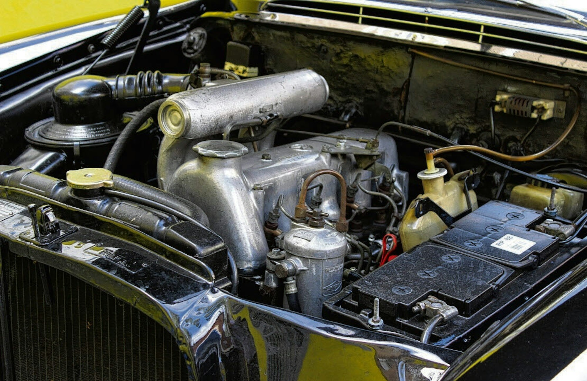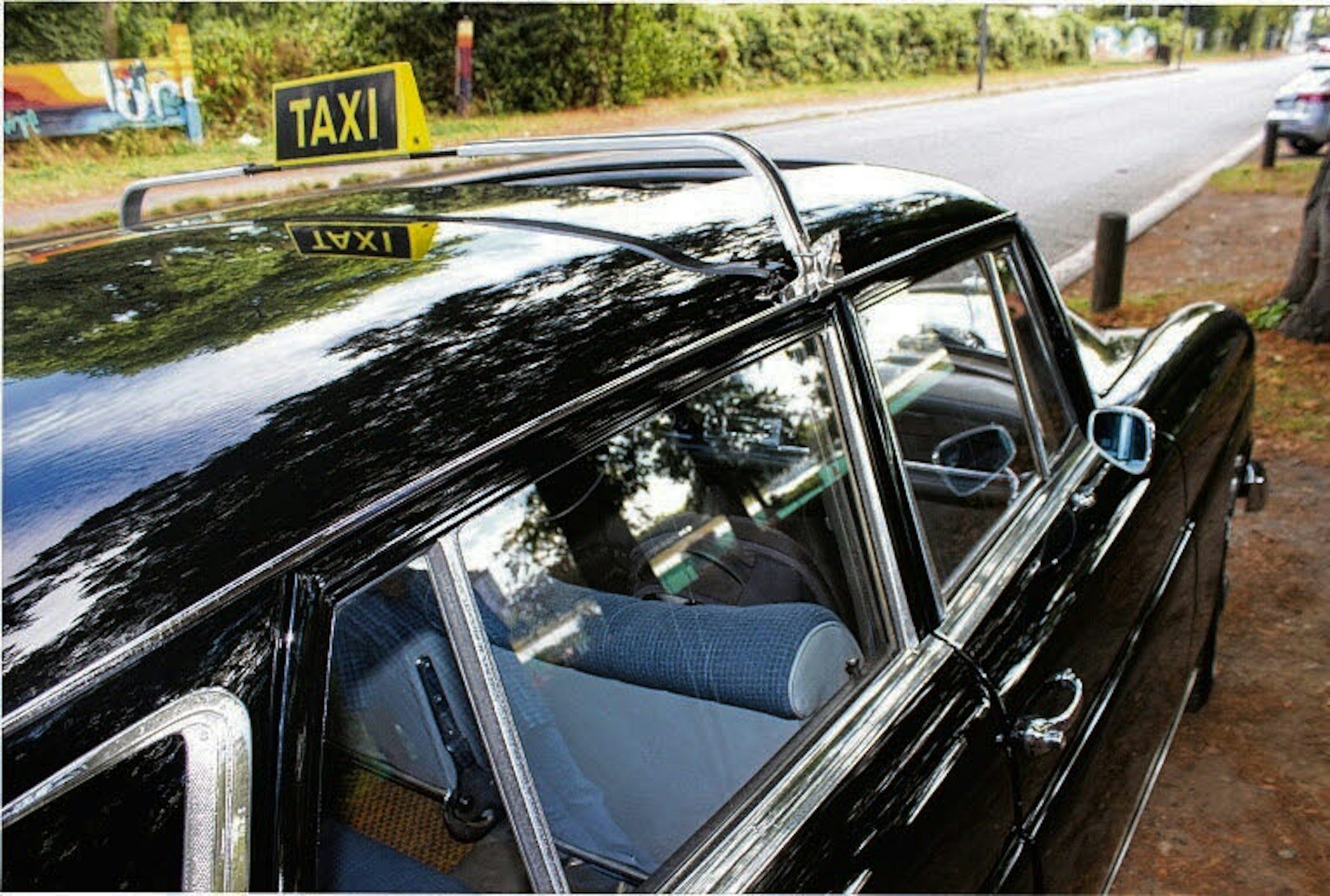 Das Ding ist lang und piept nicht. Man kann die Ausmaße ganz schlecht abschätzen. Ich habe mich wohl zu sehr an die modernen Assistenzsysteme gewöhnt. Das habe ich für ihn getan: Der Wagen ist rundum hervorragend restauriert worden. Früher war er blau, heute ist er schwarz und hat ein Taxi-Schild auf dem Dach. So sahen die Taxis früher aus. Ich habe nur das alte Autoradio, das irgendein 0815-Radio war, durch ein Retro-Exemplar mit besserem Empfang ausgetauscht. Das hat ein historisches Design, aber eine aktuelle Technik. Die Kabelzugänge vom Motor in den Innenraum habe ich mit einem Silikonzeug abgedichtet, damit keine Feuchtigkeit eindringt. Auf Rost muss man bei diesem Auto höllisch aufpassen.