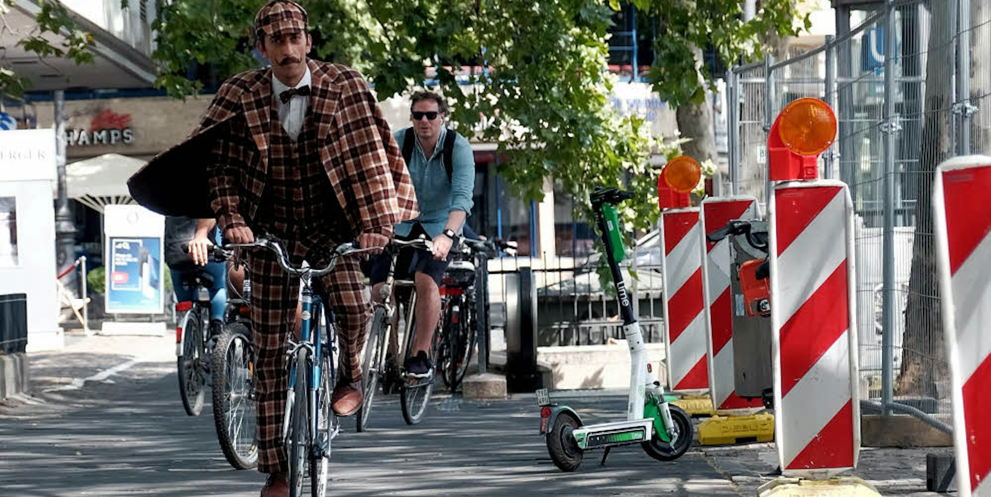 Mit dem Rad unterwegs am Rudolfplatz: Schauspieler Peter Zgraggen in seiner Detektivs-Kluft als Inspector Carter.