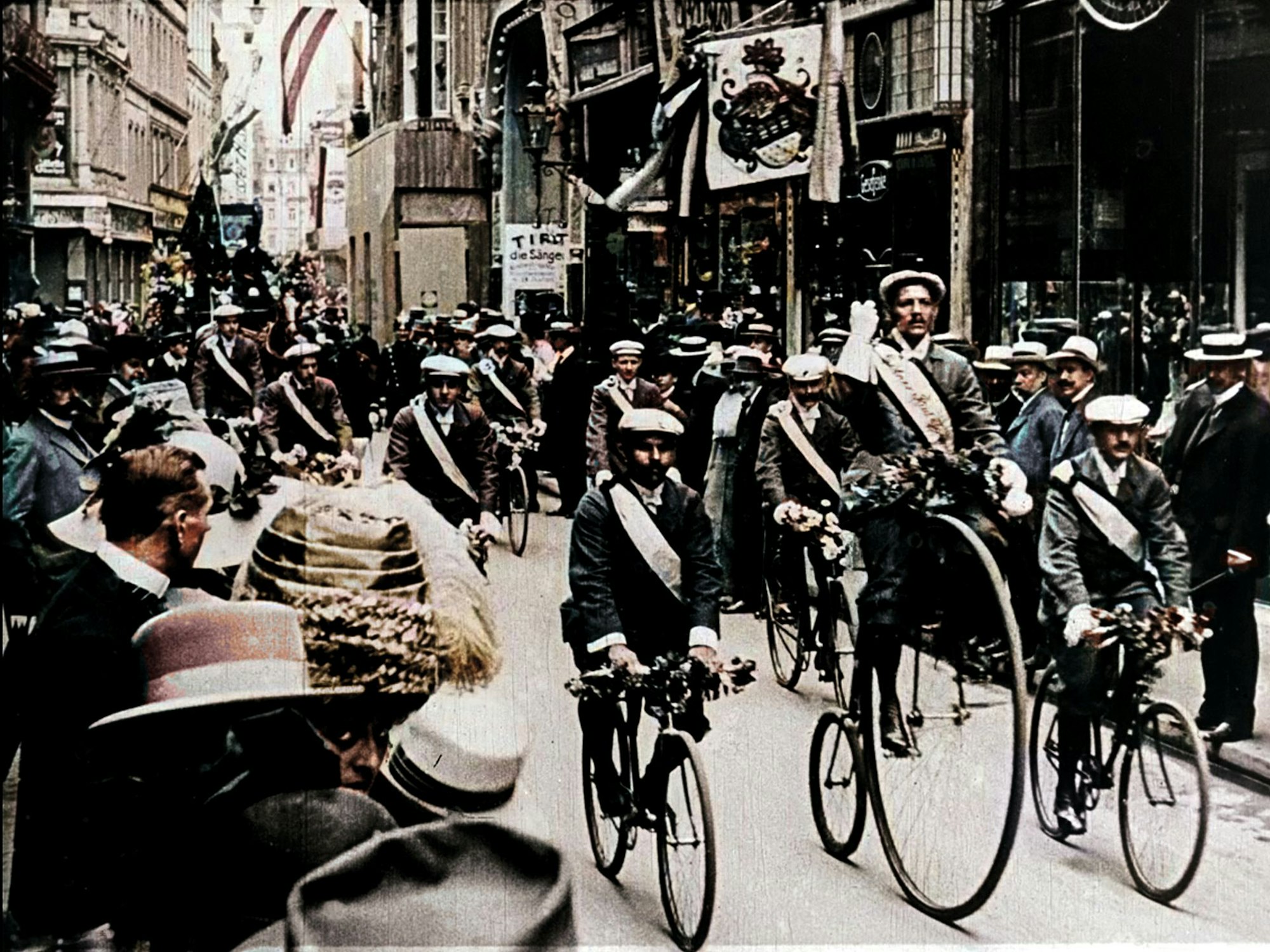 Wie die Gesellschaft zur Kaiserzeit tickte, verdeutlicht etwa diese Episode: Bei der Auftaktparade der „Vaterländischen Festspiele“ im Jahr 1912 fahren auch Frauen mit ihren Rädern über die prall gefüllte Hohe Straße. Das ist damals alles andere als selbstverständlich: „Bis vor wenigen Jahren galt es als unschicklich, sich als Frau auf ein Rad zu setzen“, so der Kommentar.